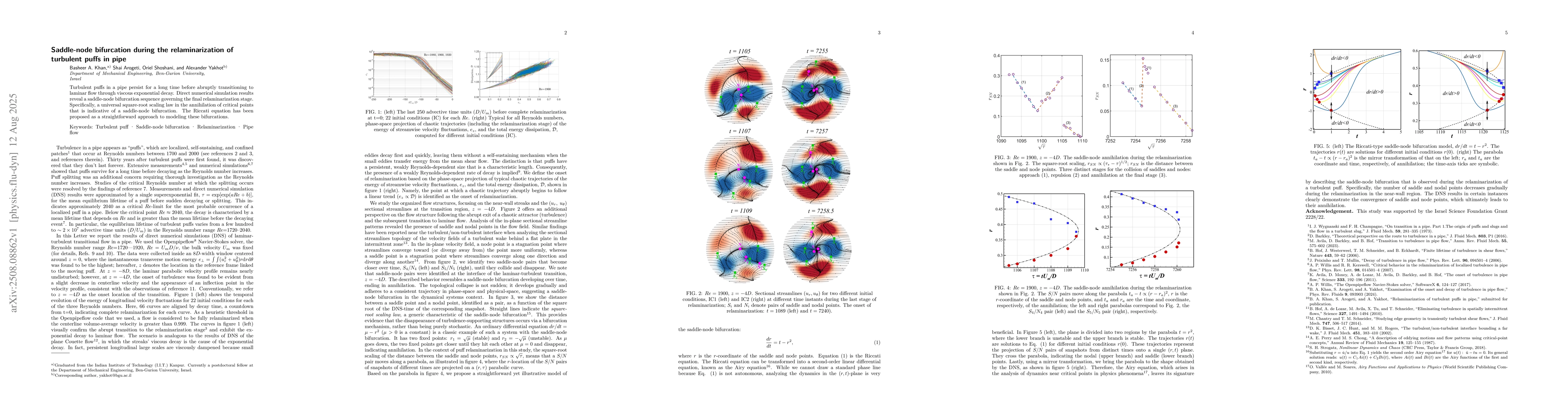 Turbulent puffs in a pipe persist for a long time before abruptly transitioning to laminar flow through viscous exponential decay. Direct numerical simulation results reveal a saddle-node bifurcation sequence governing the final relaminarization stage. Specifically, a universal square-root scaling law in the annihilation of critical points that is indicative of a saddle-node bifurcation. The Riccati equation has been proposed as a straightforward approach to modeling these bifurcations.