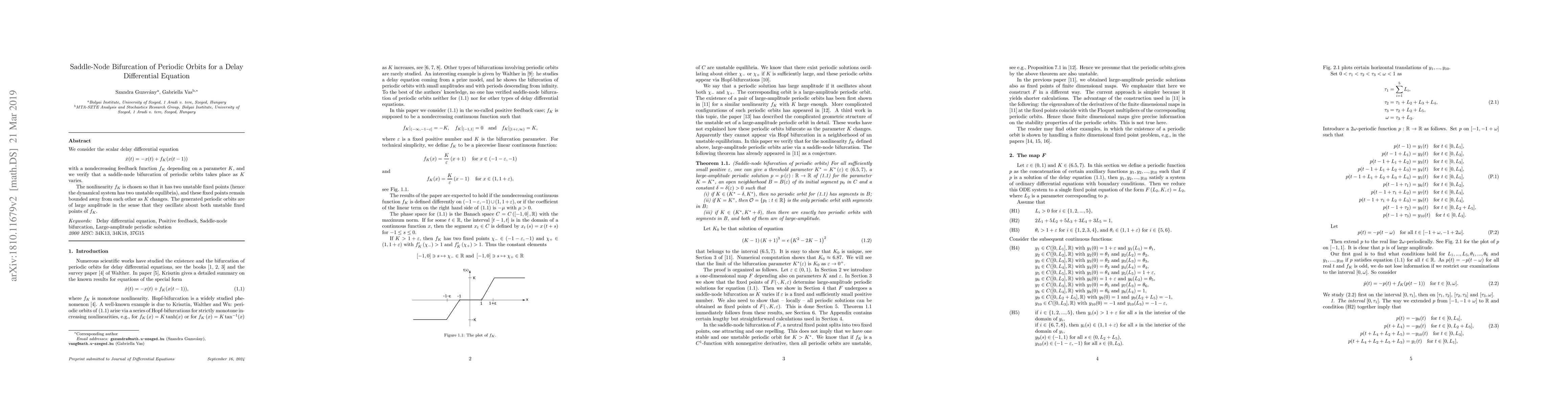 A saddle-node bifurcation of periodic orbits is observed in a delay differential equation as a parameter K varies, leading to the emergence of large-amplitude oscillations around two unstable fixed points.