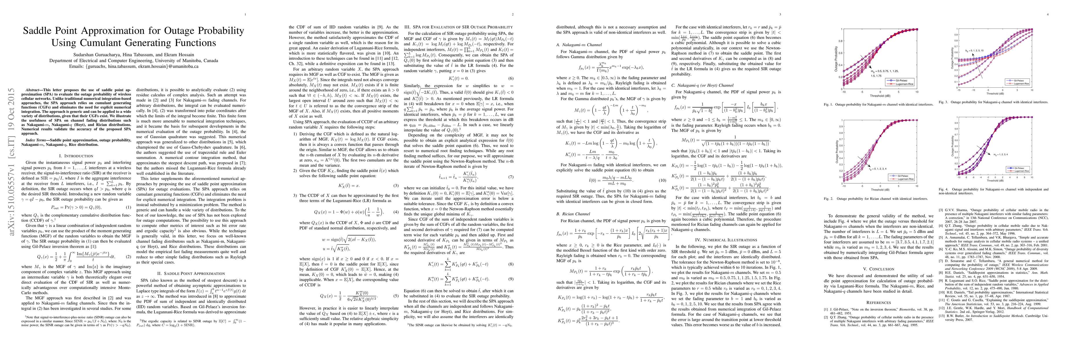 A new method called Saddle Point Approximation uses cumulant generating functions to quickly calculate outage probabilities in wireless networks without needing explicit numerical integration. This approach is accurate and can be applied to various distributions.