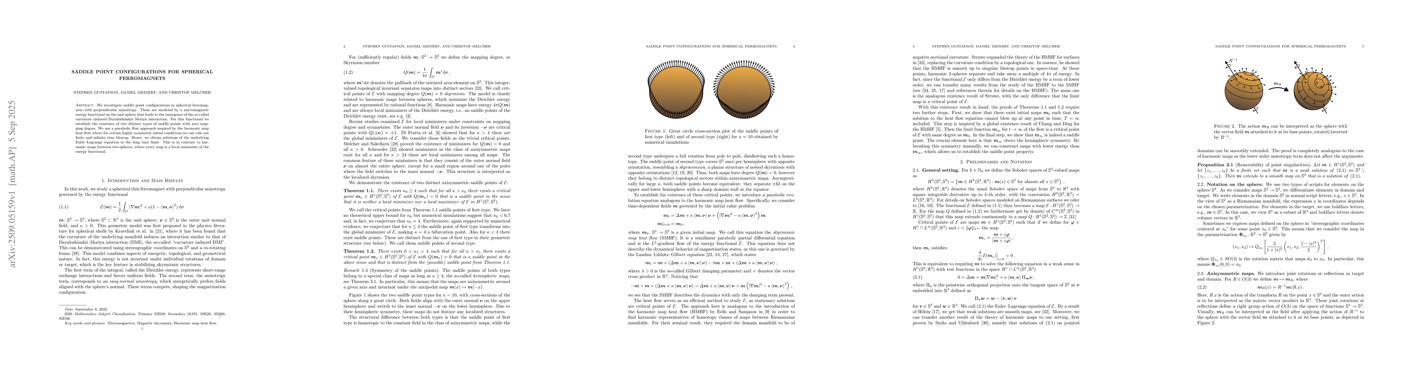 We investigate saddle point configurations in spherical ferromagnets with perpendicular anisotropy. These are modeled by a micromagnetic energy functional on the unit sphere that leads to the emergence of the so-called curvature induced Dzyaloshinskii--Moriya interaction. For this functional we establish the existence of two distinct types of saddle points with zero mapping degree. We use a parabolic flow approach inspired by the harmonic map heat flow where for certain highly symmetric initial conditions we can rule out finite and infinite time blowup. Hence, we obtain solutions of the underlying Euler--Lagrange equation in the long time limit. This is in contrast to harmonic maps between two-spheres, where every map is a local minimizer of the energy functional.