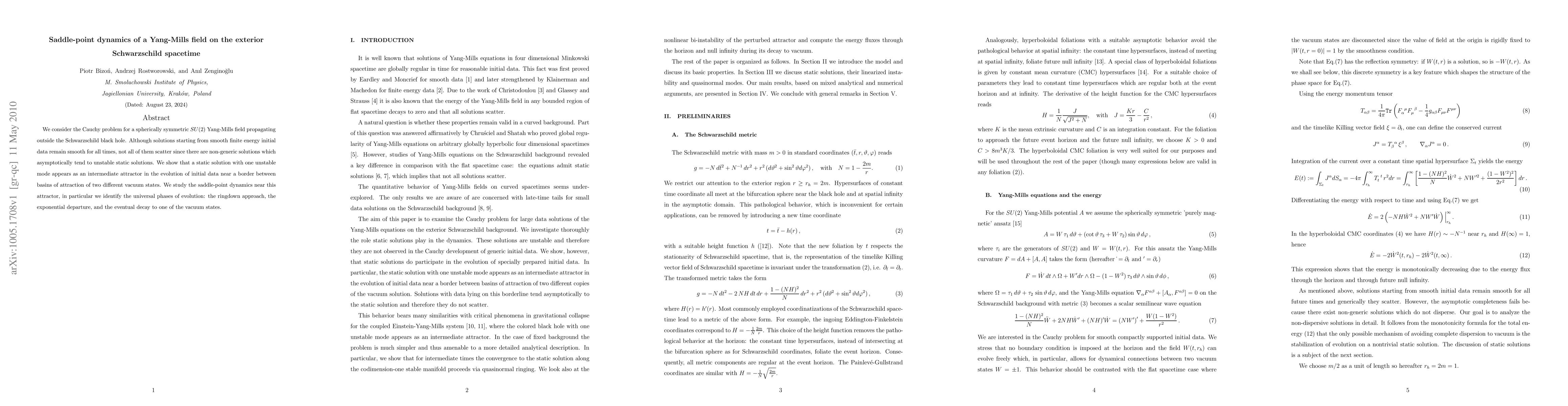 We consider the Cauchy problem for a spherically symmetric SU(2) Yang-Mills field propagating outside the Schwarzschild black hole. Although solutions starting from smooth finite energy initial data remain smooth for all times, not all of them scatter since there are non-generic solutions which asymptotically tend to unstable static solutions. We show that a static solution with one unstable mode appears as an intermediate attractor in the evolution of initial data near a border between basins of attraction of two different vacuum states. We study the saddle-point dynamics near this attractor, in particular we identify the universal phases of evolution: the ringdown approach, the exponential departure, and the eventual decay to one of the vacuum states.