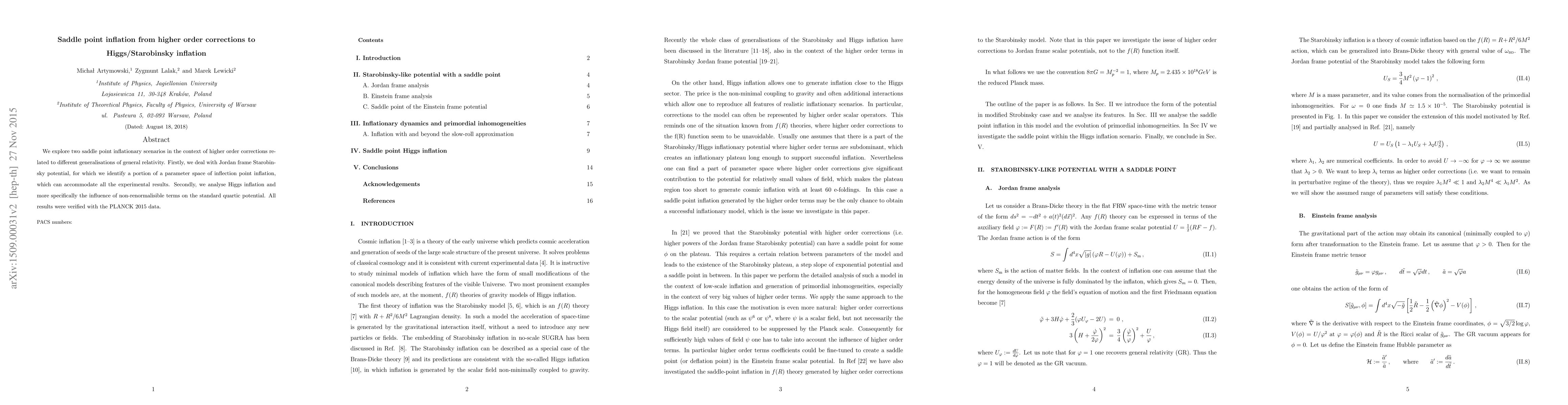 We explore two saddle point inflationary scenarios in the context of higher order corrections related to different generalisations of general relativity. Firstly, we deal with Jordan frame Starobinsky potential, for which we identify a portion of a parameter space of inflection point inflation, which can accommodate all the experimental results. Secondly, we analyse Higgs inflation and more specifically the influence of non-renormalisible terms on the standard quartic potential. All results were verified with the PLANCK 2015 data.