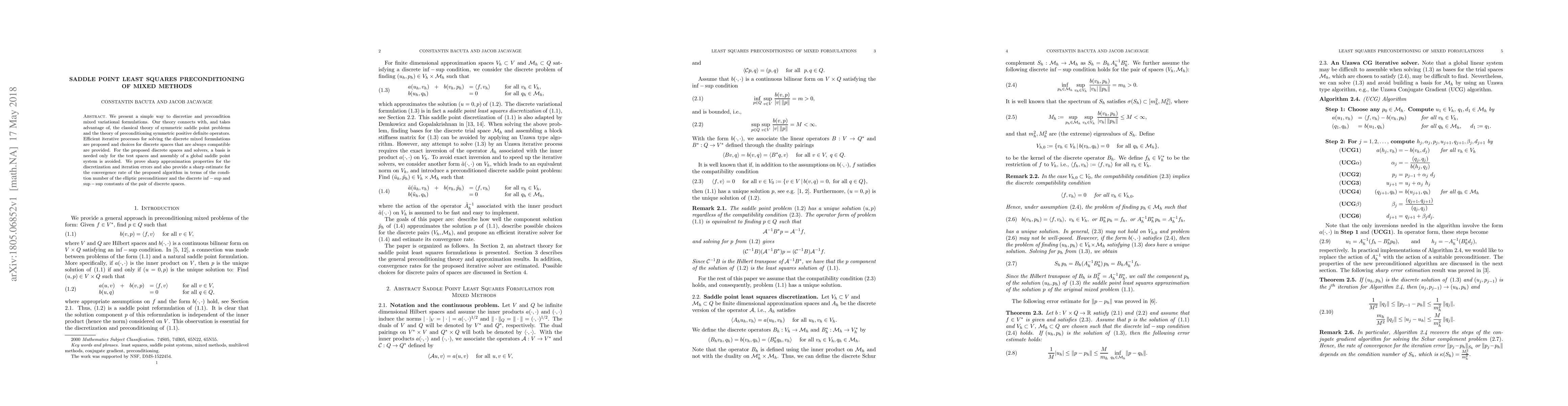 This paper introduces a novel preconditioning technique for mixed variational formulations based on saddle point least squares, leveraging classical saddle point theory and preconditioning methods. It proposes efficient iterative solvers and compatible discrete spaces, while avoiding the assembly of a global saddle point system, and provides sharp estimates for discretization and convergence rates.