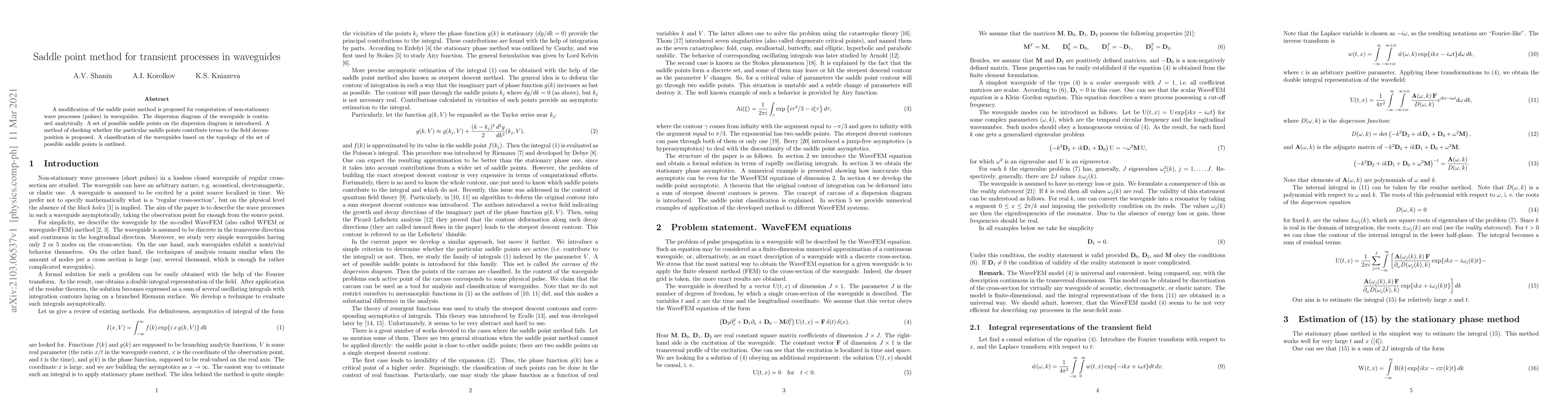 A modification of the saddle point method is proposed for computation of non-stationary wave processes (pulses) in waveguides. The dispersion diagram of the waveguide is continued analytically. A set of possible saddle points on the dispersion diagram is introduced. A method of checking whether the particular saddle points contribute terms to the field decomposition is proposed. A classification of the waveguides based on the topology of the set of possible saddle points is outlined.