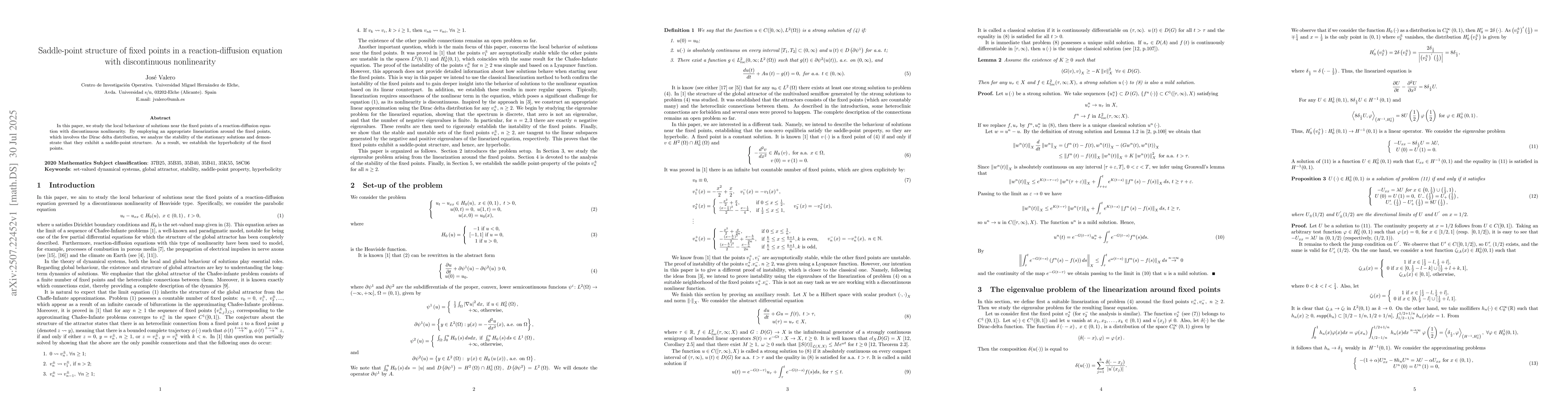 In this paper, we study the local behaviour of solutions near the fixed points of a reaction-diffusion equation with discontinuous nonlinearity. By employing an appropriate linearization around the fixed points, which involves the Dirac delta distribution, we analyze the stability of the stationary solutions and demonstrate that they exhibit a saddle-point structure. As a result, we establish the hyperbolicity of the fixed points.