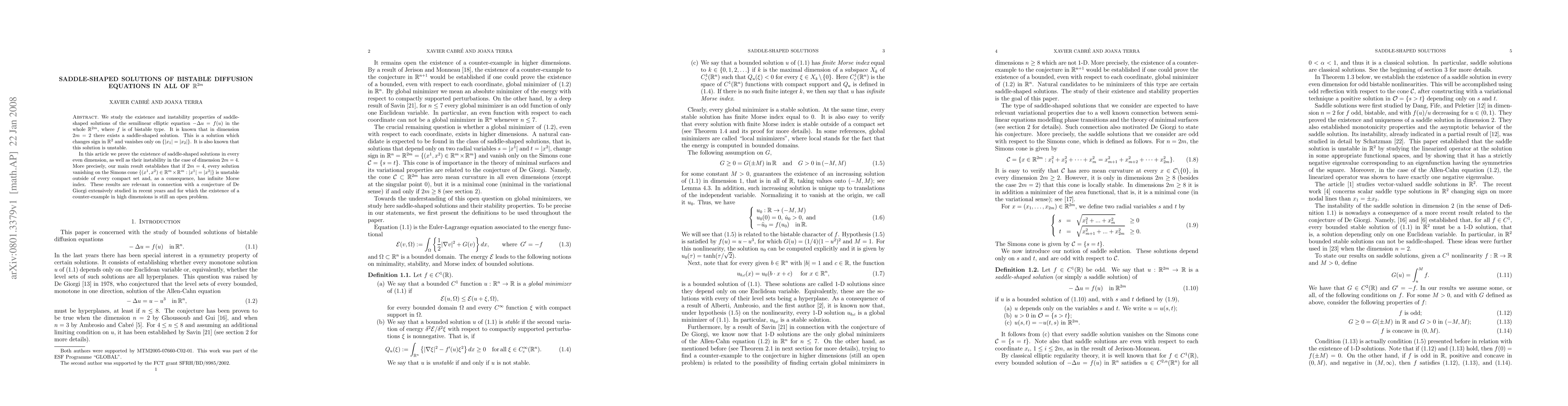 We study the existence and instability properties of saddle-shaped solutions of the semilinear elliptic equation $-\Delta u = f(u)$ in the whole $\R^{2m}$, where $f$ is of bistable type. It is known that in dimension $2m=2$ there exists a saddle-shaped solution. This is a solution which changes sign in $\R^2$ and vanishes only on $\{|x_1|=|x_2|\}$. It is also known that this solution is unstable. In this article we prove the existence of saddle-shaped solutions in every even dimension, as well as their instability in the case of dimension $2m=4$. More precisely, our main result establishes that if $2m=4$, every solution vanishing on the Simons cone $\{(x^1,x^2)\in\R^m\times\R^m : |x^1|=|x^2|\}$ is unstable outside of every compact set and, as a consequence, has infinite Morse index. These results are relevant in connection with a conjecture of De Giorgi extensively studied in recent years and for which the existence of a counter-example in high dimensions is still an open problem.