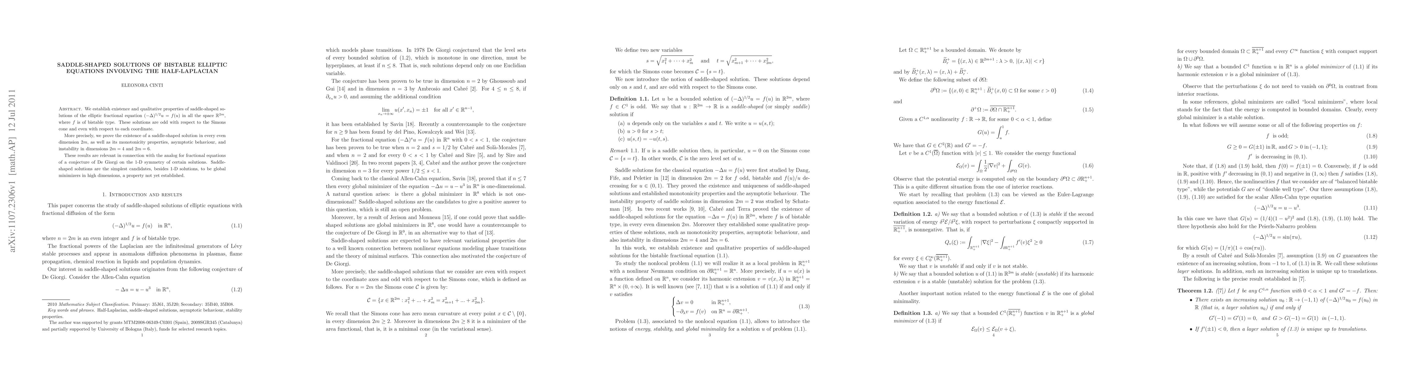 We establish existence and qualitative properties of saddle-shaped solutions of the elliptic fractional equation $(-\Delta)^{1/2}u=f(u)$ in all the space $\re^{2m}$, where $f$ is of bistable type. These solutions are odd with respect to the Simons cone and even with respect to each coordinate. More precisely, we prove the existence of a saddle-shaped solution in every even dimension $2m$, as well as its monotonicity properties, asymptotic behaviour, and instability in dimensions $2m=4$ and $2m=6$. These results are relevant in connection with the analog for fractional equations of a conjecture of De Giorgi on the 1-D symmetry of certain solutions. Saddle-shaped solutions are the simplest candidates, besides 1-D solutions, to be global minimizers in high dimensions, a property not yet established.