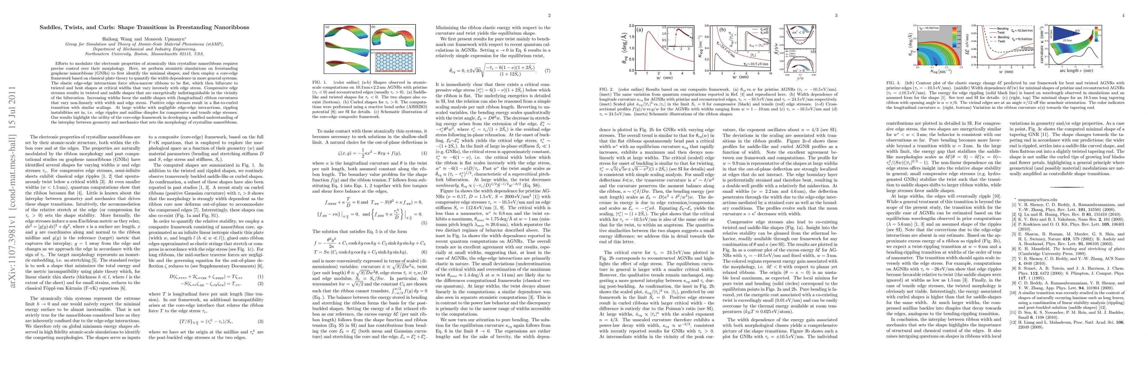 This paper investigates the shape transitions in freestanding graphene nanoribbons through atomistic simulations, revealing how ultra-narrow ribbons transition from flat to twisted and bent forms based on width and edge stress. The core-edge framework elucidates the morphological changes, showing the influence of edge stresses on the ribbon's curvature and the emergence of rippling instabilities at larger widths.