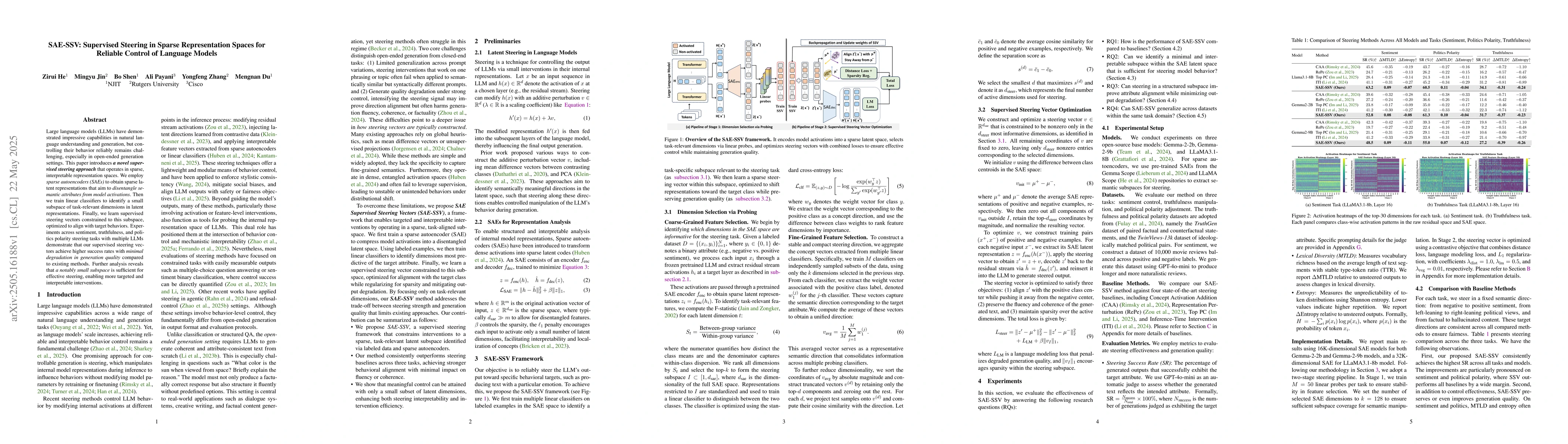 The paper introduces a novel supervised steering approach using sparse autoencoders (SAEs) to obtain sparse latent representations, trains linear classifiers for task-relevant dimensions, and learns supervised steering vectors constrained to this subspace, optimized for target behaviors.
