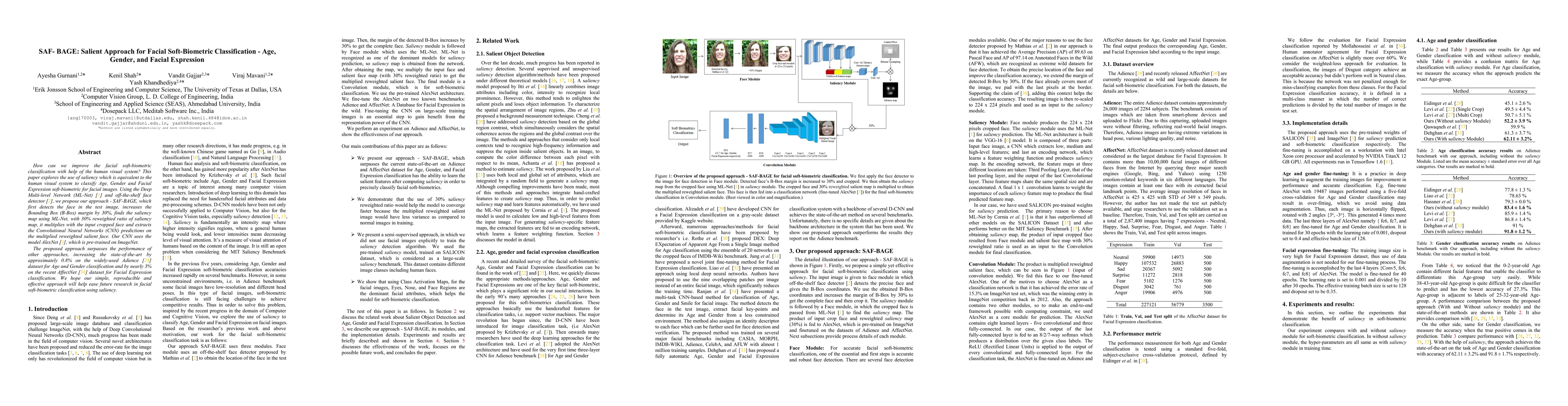 The SAF-BAGE approach leverages saliency maps to mimic human visual focus for improved facial soft-biometric classification of Age, Gender, and Facial Expression. Using a Deep Multi-level Network and AlexNet, it enhances salient face features, achieving better results than other methods on Adience and AffectNet datasets.