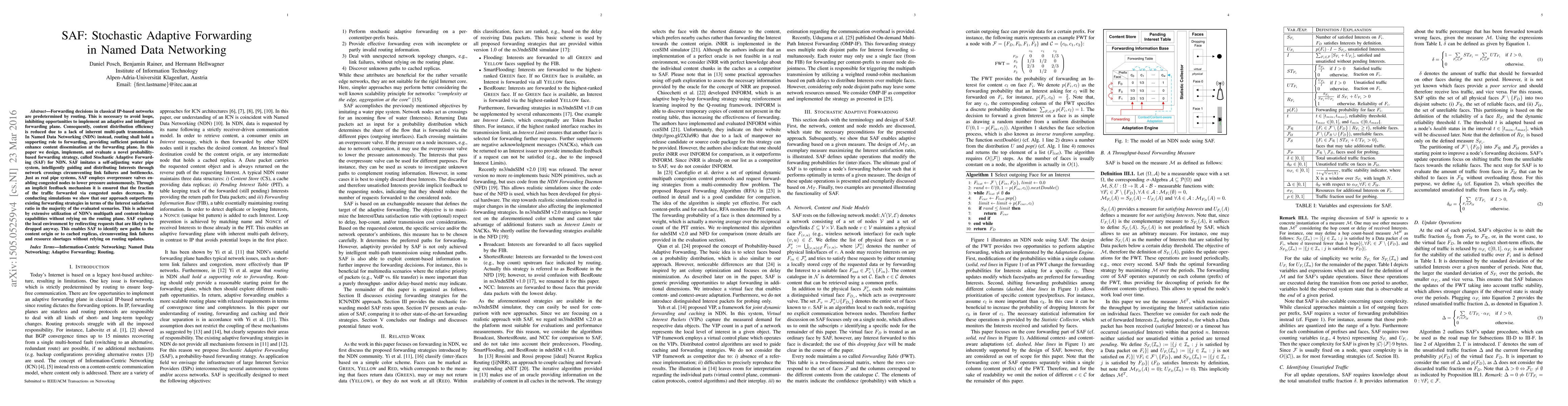 The paper presents Stochastic Adaptive Forwarding (SAF), a novel probability-based forwarding strategy for Named Data Networking (NDN) that enhances content distribution efficiency by utilizing multipath and content-lookup capabilities. SAF dynamically adjusts to network congestion and link failures, improving the Interest satisfaction ratio over existing strategies through simulations.