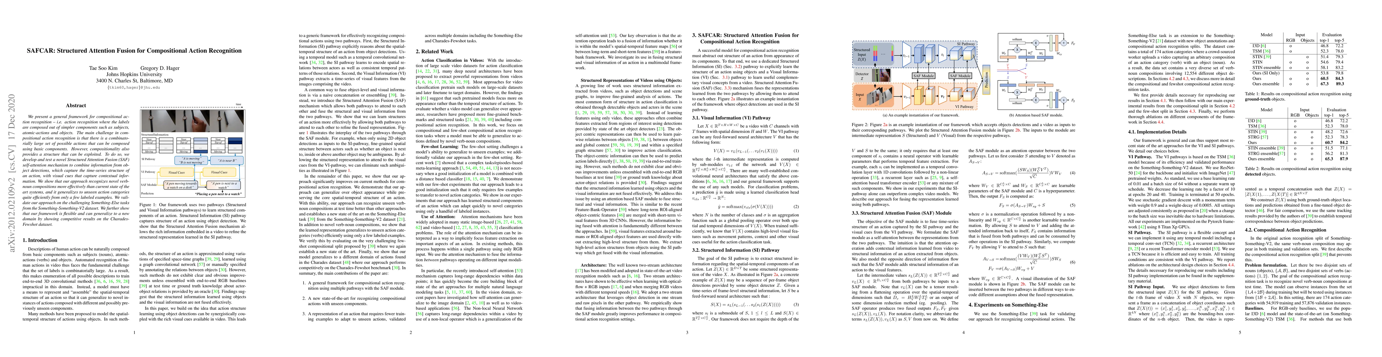 This paper introduces a novel Structured Attention Fusion (SAF) mechanism for compositional action recognition, effectively combining object detections and visual cues to recognize complex actions composed of basic components. The proposed method outperforms existing systems in recognizing novel actions and demonstrates good generalization from limited labeled examples.