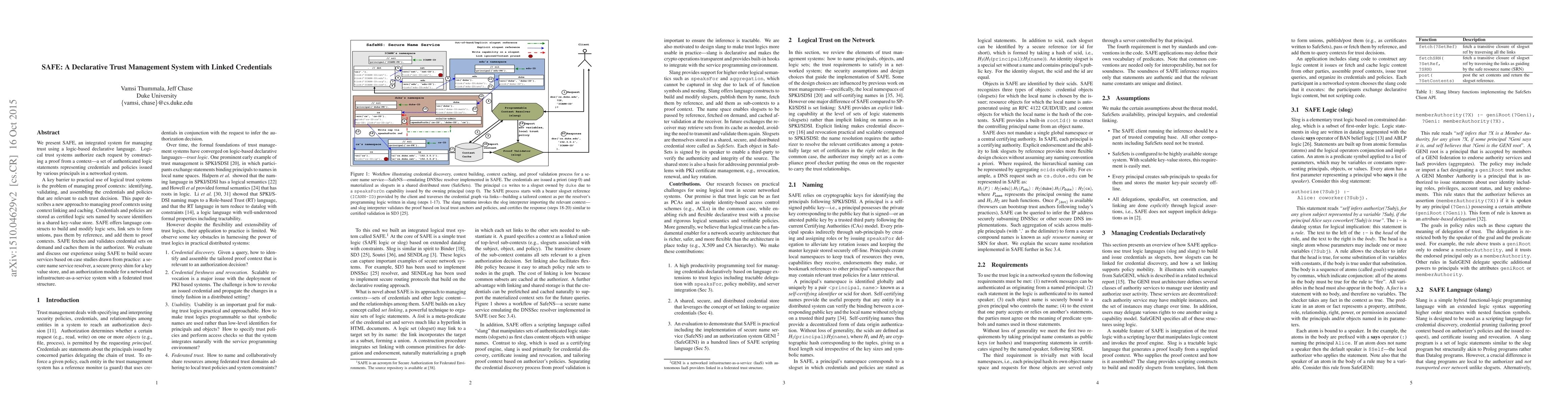 SAFE is a declarative trust management system that uses a logic-based language to manage proof contexts for authorization decisions. It employs context linking and caching to efficiently handle credentials and policies, demonstrating its application through secure service case studies.