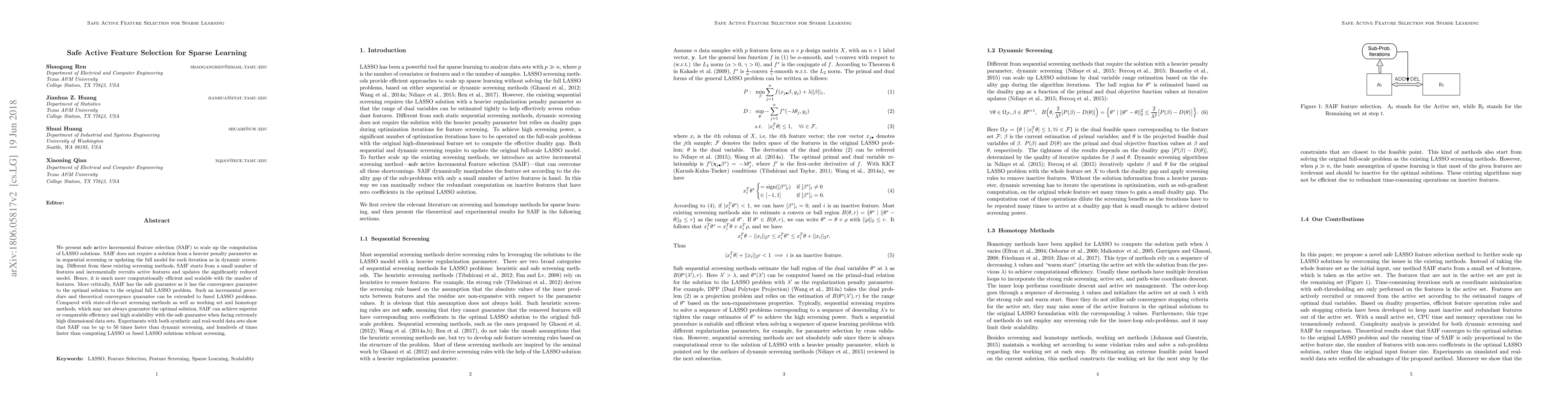 The paper introduces Safe Active Incremental Feature Selection (SAIF) for efficient LASSO solution computation, which incrementally recruits features while maintaining computational efficiency and scalability. SAIF guarantees convergence to the optimal LASSO solution, outperforming other methods in speed and scalability.