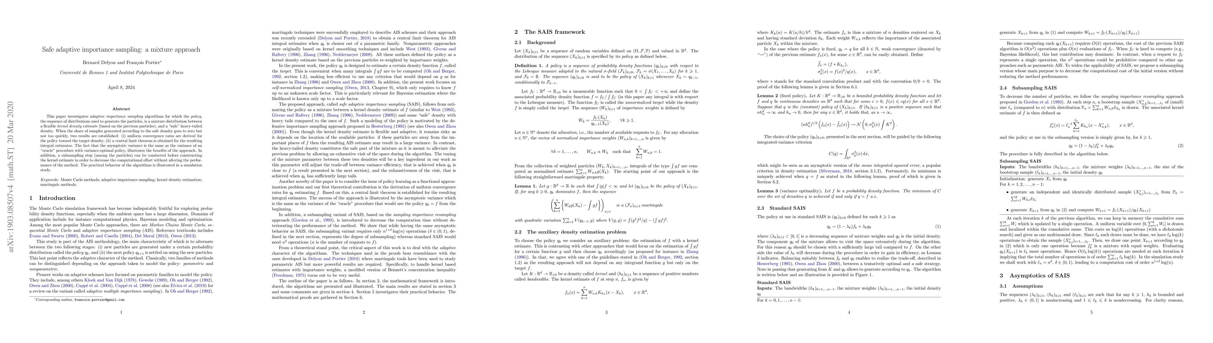 This paper proposes adaptive importance sampling using a mixture of a flexible kernel density estimate and a "safe" heavy-tailed density, achieving uniform convergence and a central limit theorem. A subsampling step is introduced to reduce computational effort without compromising performance, validated through a simulation study.