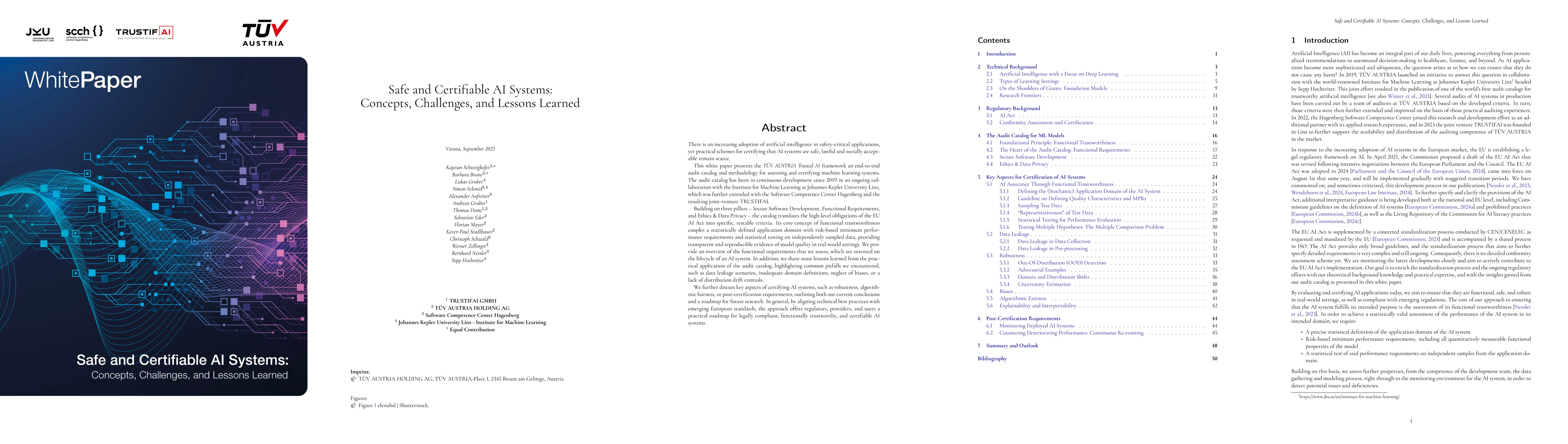 There is an increasing adoption of artificial intelligence in safety-critical applications, yet practical schemes for certifying that AI systems are safe, lawful and socially acceptable remain scarce. This white paper presents the T\"UV AUSTRIA Trusted AI framework an end-to-end audit catalog and methodology for assessing and certifying machine learning systems. The audit catalog has been in continuous development since 2019 in an ongoing collaboration with scientific partners. Building on three pillars - Secure Software Development, Functional Requirements, and Ethics & Data Privacy - the catalog translates the high-level obligations of the EU AI Act into specific, testable criteria. Its core concept of functional trustworthiness couples a statistically defined application domain with risk-based minimum performance requirements and statistical testing on independently sampled data, providing transparent and reproducible evidence of model quality in real-world settings. We provide an overview of the functional requirements that we assess, which are oriented on the lifecycle of an AI system. In addition, we share some lessons learned from the practical application of the audit catalog, highlighting common pitfalls we encountered, such as data leakage scenarios, inadequate domain definitions, neglect of biases, or a lack of distribution drift controls. We further discuss key aspects of certifying AI systems, such as robustness, algorithmic fairness, or post-certification requirements, outlining both our current conclusions and a roadmap for future research. In general, by aligning technical best practices with emerging European standards, the approach offers regulators, providers, and users a practical roadmap for legally compliant, functionally trustworthy, and certifiable AI systems.
