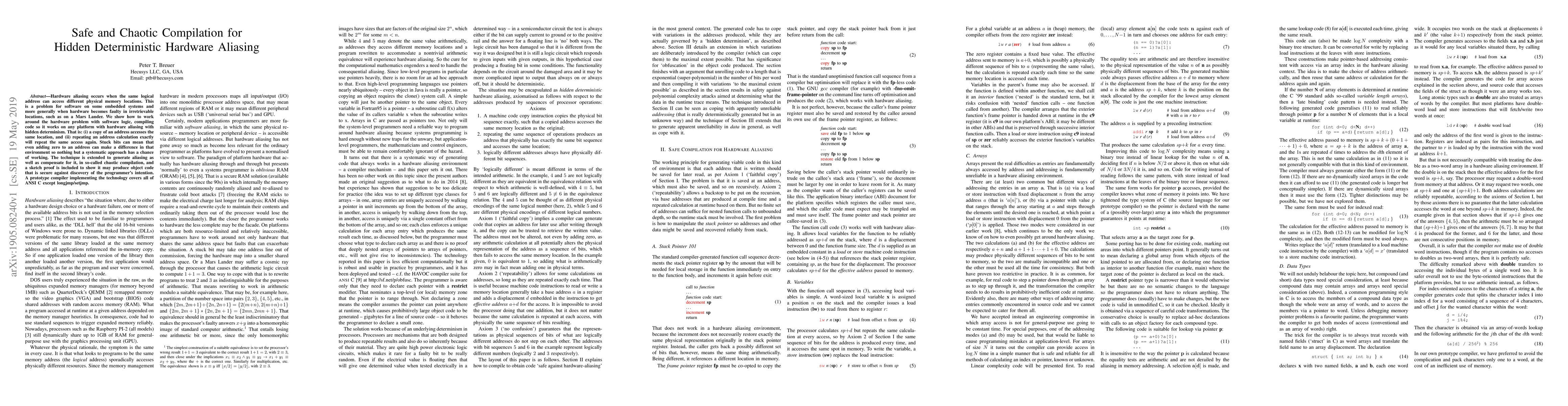 Hardware aliasing occurs when the same logical address can access different physical memory locations. This is a problem for software on some embedded systems and more generally when hardware becomes faulty in irretrievable locations, such as on a Mars Lander. We show how to work around the hardware problem with software logic, compiling code so it works on any platform with hardware aliasing with hidden determinism. That is: (i) a copy of an address accesses the same location, and (ii) repeating an address calculation exactly will repeat the same access again. Stuck bits can mean that even adding zero to an address can make a difference in that environment so nothing but a systematic approach has a chance of working. The technique is extended to generate aliasing as well as compensate for it, in so-called chaotic compilation, and a sketch proof is included to show it may produce object code that is secure against discovery of the programmer's intention. A prototype compiler implementing the technology covers all of ANSI C except longjmp/setjmp.