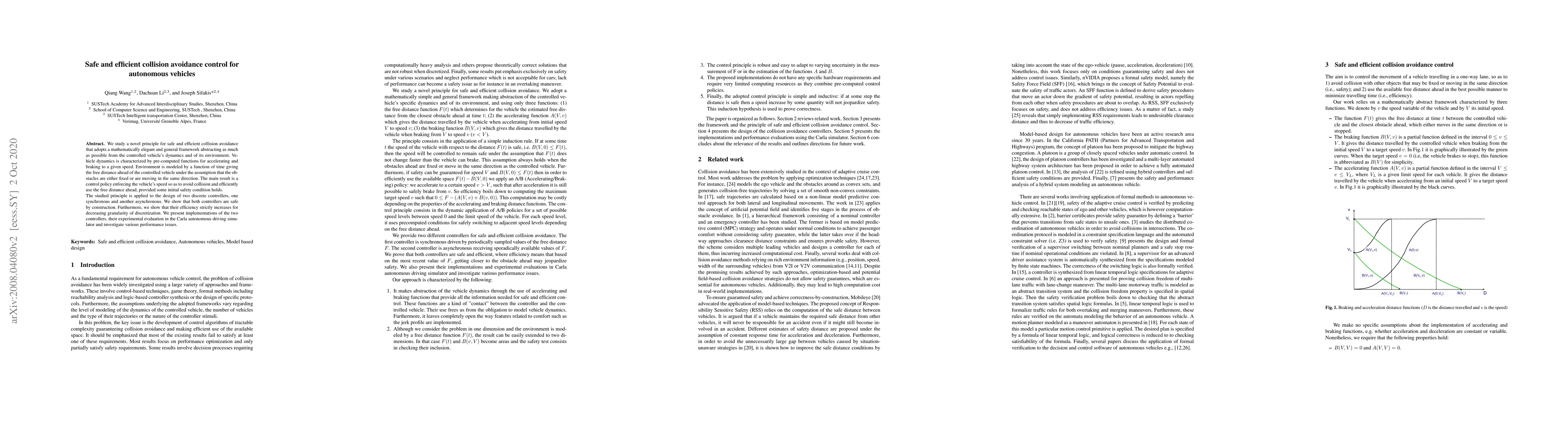 We study a novel principle for safe and efficient collision avoidance that adopts a mathematically elegant and general framework abstracting as much as possible from the controlled vehicle's dynamics and of its environment. Vehicle dynamics is characterized by pre-computed functions for accelerating and braking to a given speed. Environment is modeled by a function of time giving the free distance ahead of the controlled vehicle under the assumption that the obstacles are either fixed or are moving in the same direction. The main result is a control policy enforcing the vehicle's speed so as to avoid collision and efficiently use the free distance ahead, provided some initial safety condition holds. The studied principle is applied to the design of two discrete controllers, one synchronous and another asynchronous. We show that both controllers are safe by construction. Furthermore, we show that their efficiency strictly increases for decreasing granularity of discretization. We present implementations of the two controllers, their experimental evaluation in the Carla autonomous driving simulator and investigate various performance issues.