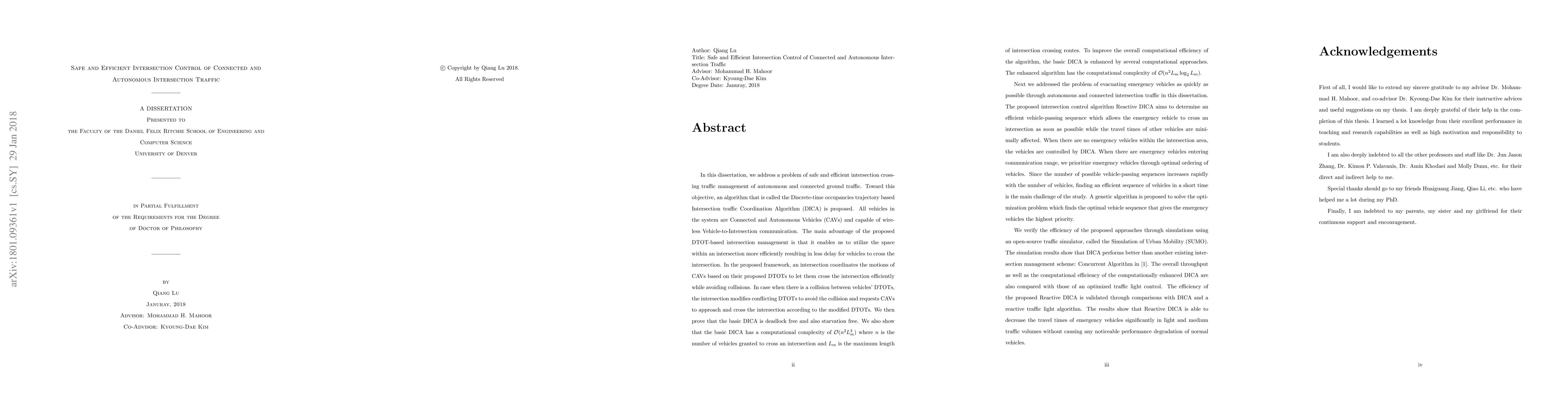 In this dissertation, we address a problem of safe and efficient intersection crossing traffic management of autonomous and connected ground traffic. Toward this objective, an algorithm that is called the Discrete-time occupancies trajectory based Intersection traffic Coordination Algorithm (DICA) is proposed. All vehicles in the system are Connected and Autonomous Vehicles (CAVs) and capable of wireless Vehicle-to-Intersection communication. In the proposed framework, an intersection coordinates the motions of CAVs based on their proposed DTOTs to let them cross the intersection efficiently while avoiding collisions. In case when there is a collision between vehicles' DTOTs, the intersection modifies conflicting DTOTs to avoid the collision and requests CAVs to approach and cross the intersection according to the modified DTOTs. We then prove that the basic DICA is deadlock free and also starvation free. We also show that the basic DICA is conservative in computational complexity and improve it by several computational approaches. Next, we addressed the problem of evacuating emergency vehicles as quickly as possible through autonomous and connected intersection traffic in this dissertation. The proposed intersection control algorithm Reactive DICA aims to determine an efficient vehicle-passing sequence which allows the emergency vehicle to cross an intersection as soon as possible while the travel times of other vehicles are minimally affected. When there are no emergency vehicles within the intersection area, the vehicles are controlled by DICA. When there are emergency vehicles entering communication range, we prioritize emergency vehicles through optimal ordering of vehicles. A genetic algorithm is proposed to solve the optimization problem which finds the optimal vehicle sequence that gives the emergency vehicles the highest priority.