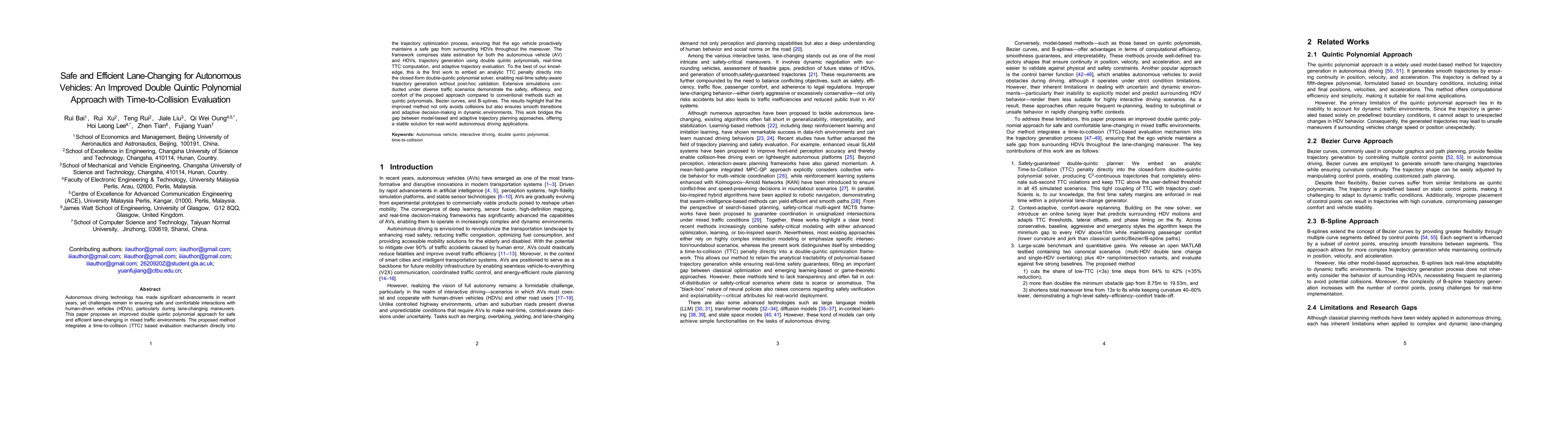 Autonomous driving technology has made significant advancements in recent years, yet challenges remain in ensuring safe and comfortable interactions with human-driven vehicles (HDVs), particularly during lane-changing maneuvers. This paper proposes an improved double quintic polynomial approach for safe and efficient lane-changing in mixed traffic environments. The proposed method integrates a time-to-collision (TTC) based evaluation mechanism directly into the trajectory optimization process, ensuring that the ego vehicle proactively maintains a safe gap from surrounding HDVs throughout the maneuver. The framework comprises state estimation for both the autonomous vehicle (AV) and HDVs, trajectory generation using double quintic polynomials, real-time TTC computation, and adaptive trajectory evaluation. To the best of our knowledge, this is the first work to embed an analytic TTC penalty directly into the closed-form double-quintic polynomial solver, enabling real-time safety-aware trajectory generation without post-hoc validation. Extensive simulations conducted under diverse traffic scenarios demonstrate the safety, efficiency, and comfort of the proposed approach compared to conventional methods such as quintic polynomials, Bezier curves, and B-splines. The results highlight that the improved method not only avoids collisions but also ensures smooth transitions and adaptive decision-making in dynamic environments. This work bridges the gap between model-based and adaptive trajectory planning approaches, offering a stable solution for real-world autonomous driving applications.