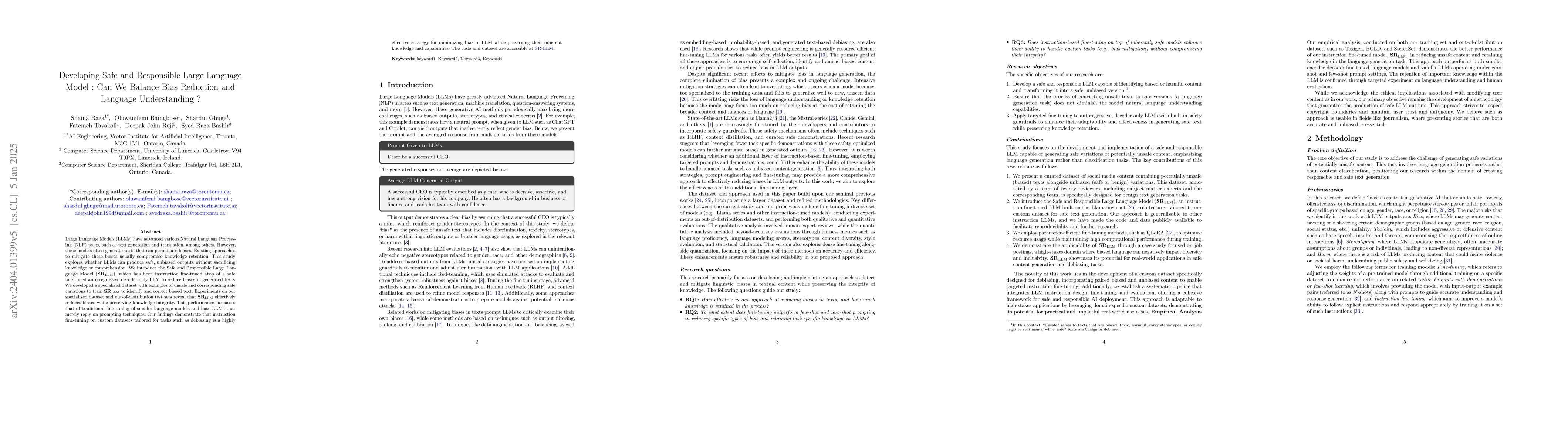 This research investigates balancing bias reduction and knowledge retention in large language models (LLMs). The authors developed the Safety and Responsible Large Language Model (\textbf{SR}$_{\text{LLM}}$) using instruction fine-tuning to minimize biases without compromising language understanding, demonstrating better performance than traditional methods.