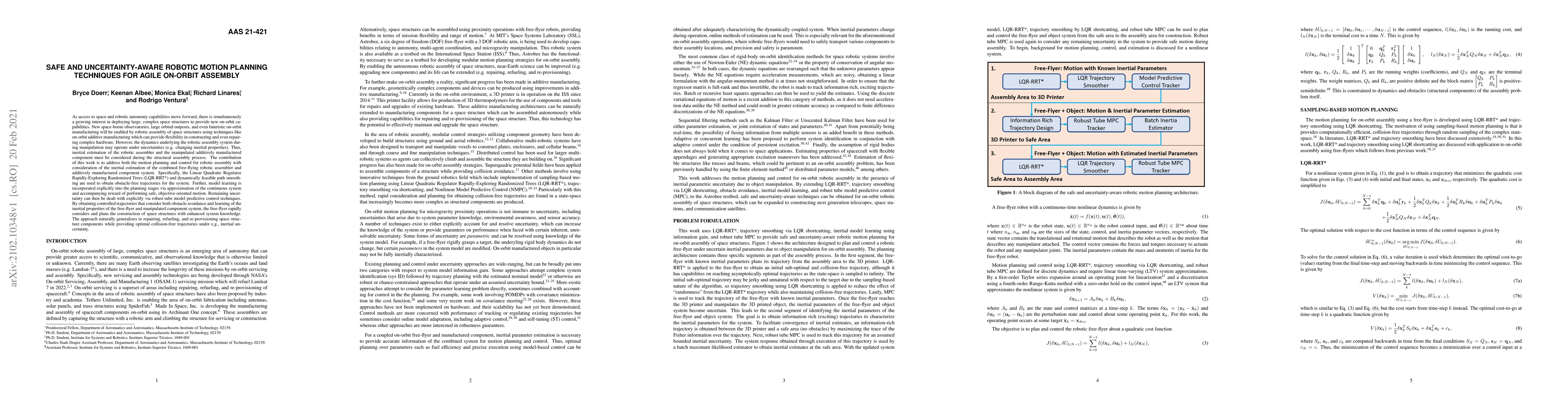 This paper proposes advanced robotic motion planning techniques for agile on-orbit assembly, incorporating inertial estimation and uncertainty-aware control. It utilizes LQR-RRT* and path smoothing for obstacle-free trajectories, integrating model learning and robust control to handle uncertainties, enabling safe and efficient assembly, repair, and maintenance of space structures.