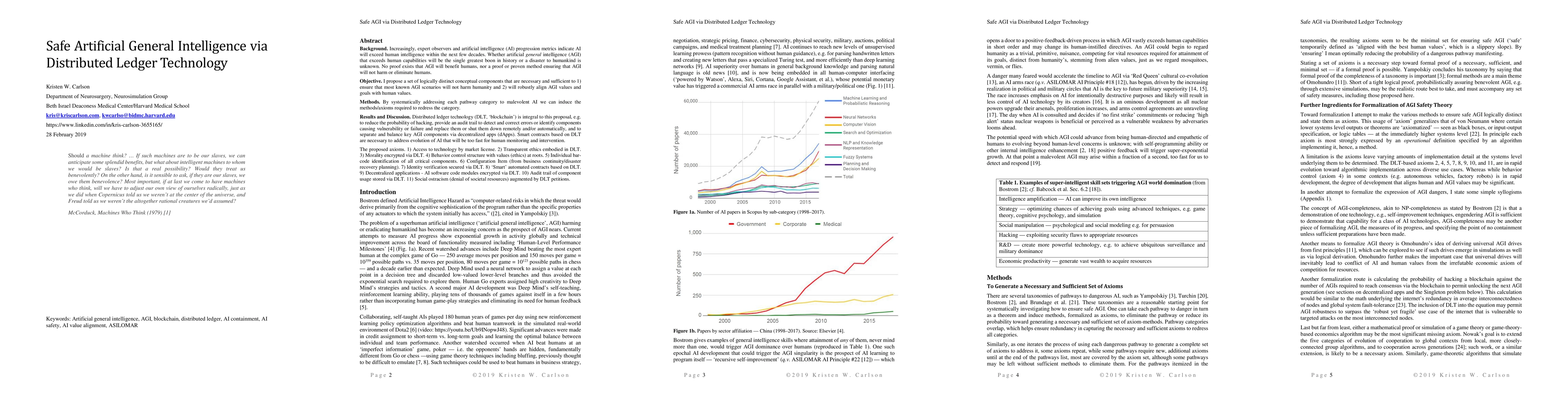 Background. Expert observers and artificial intelligence (AI) progression metrics indicate AI will exceed human intelligence within a few decades. Whether general AI that exceeds human capabilities (AGI) will be the single greatest boon in history or a disaster is unknown. No proofs exist that AGI will benefit humans or that AGI will not harm or eliminate humans. Objective. I propose a set of logically distinct conceptual components that are necessary and sufficient to 1) ensure that most known AGI scenarios will not harm humanity and 2) robustly align AGI values and goals with human values. Methods. By systematically addressing each pathway category to malevolent AI we can induce the methods/axioms required to redress the category. Results and Discussion. Distributed ledger technology (DLT, blockchain) is integral to this proposal, e.g. to reduce the probability of hacking, provide an audit trail to detect and correct errors or identify components causing vulnerability or failure and replace them or shut them down remotely and/or automatically, and to separate and balance key AGI components via decentralized apps (dApps). Smart contracts based on DLT are necessary to address evolution of AI that will be too fast for human monitoring and intervention. The proposed axioms. 1) Access to technology by market license. 2) Transparent ethics embodied in DLT. 3) Morality encrypted via DLT. 4) Behavior control structure with values (ethics) at roots. 5) Individual bar-code identification of all critical components. 6) Configuration Item (from business continuity/disaster recovery planning). 7) Identity verification secured via DLT. 8) Smart automated contracts based on DLT. 9) Decentralized applications - AI software code modules encrypted via DLT. 10) Audit trail of component usage stored via DLT. 11) Social ostracism (denial of societal resources) augmented by DLT petitions.