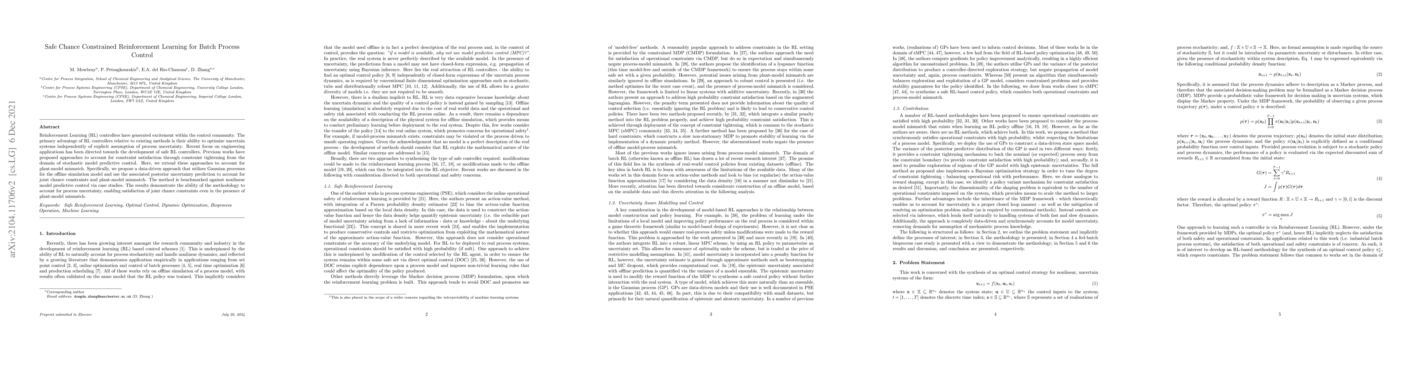 This paper proposes a safe chance constrained reinforcement learning approach for batch process control that leverages Gaussian processes to model uncertainty and ensure satisfaction of joint chance constraints, even with plant-model mismatch. The method is shown to outperform nonlinear model predictive control in case studies.