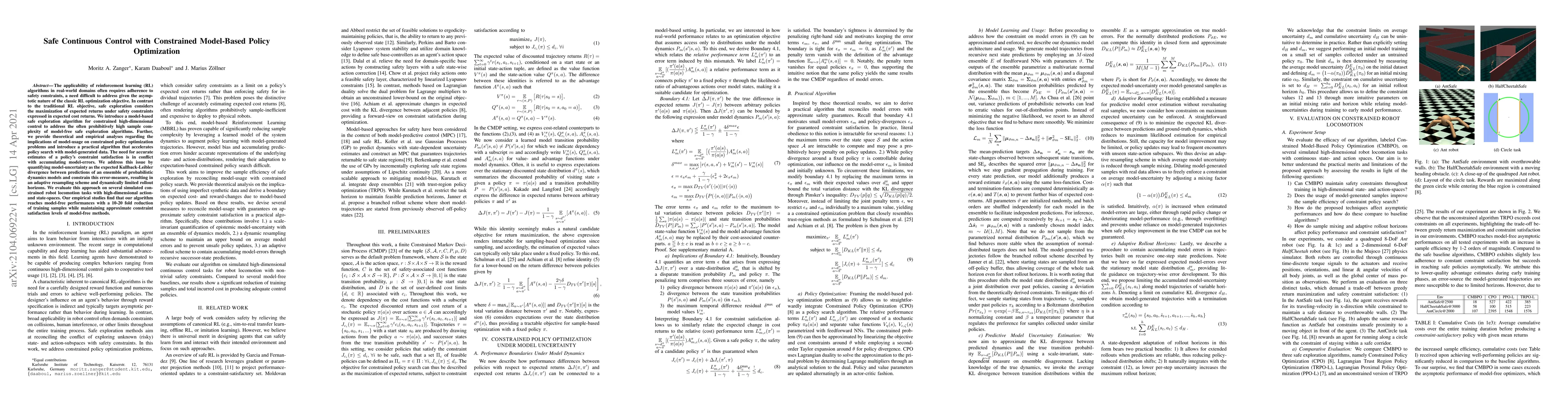 The applicability of reinforcement learning (RL) algorithms in real-world domains often requires adherence to safety constraints, a need difficult to address given the asymptotic nature of the classic RL optimization objective. In contrast to the traditional RL objective, safe exploration considers the maximization of expected returns under safety constraints expressed in expected cost returns. We introduce a model-based safe exploration algorithm for constrained high-dimensional control to address the often prohibitively high sample complexity of model-free safe exploration algorithms. Further, we provide theoretical and empirical analyses regarding the implications of model-usage on constrained policy optimization problems and introduce a practical algorithm that accelerates policy search with model-generated data. The need for accurate estimates of a policy's constraint satisfaction is in conflict with accumulating model-errors. We address this issue by quantifying model-uncertainty as the expected Kullback-Leibler divergence between predictions of an ensemble of probabilistic dynamics models and constrain this error-measure, resulting in an adaptive resampling scheme and dynamically limited rollout horizons. We evaluate this approach on several simulated constrained robot locomotion tasks with high-dimensional action- and state-spaces. Our empirical studies find that our algorithm reaches model-free performances with a 10-20 fold reduction of training samples while maintaining approximate constraint satisfaction levels of model-free methods.