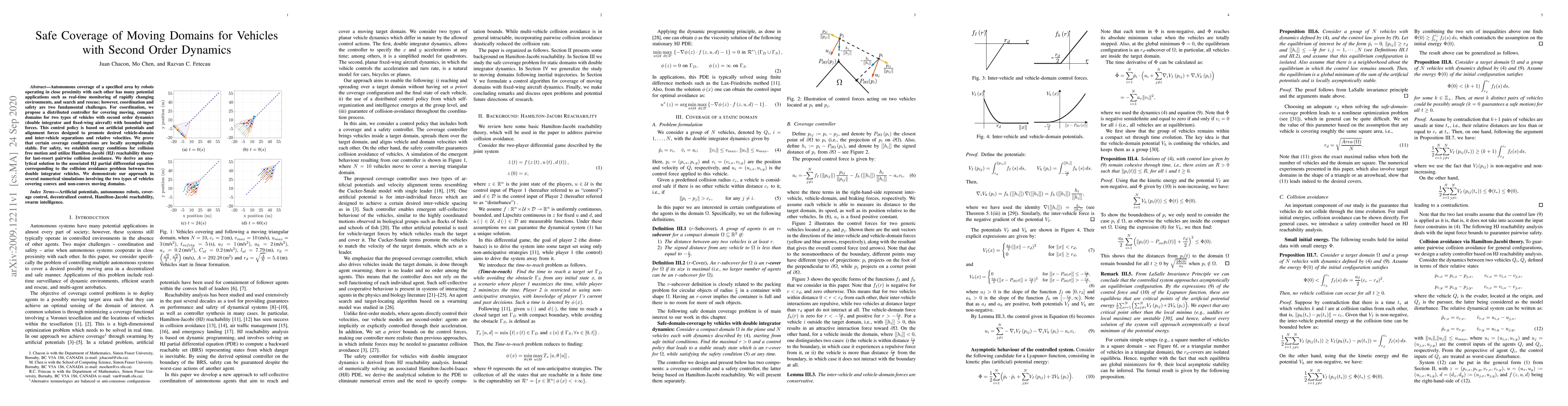 This paper proposes a distributed control strategy for autonomous vehicles with second-order dynamics to safely cover moving domains while maintaining coordination. It uses artificial potentials and alignment forces to ensure stability and local coverage, and employs Hamilton-Jacobi reachability theory for collision avoidance, validated through numerical simulations.