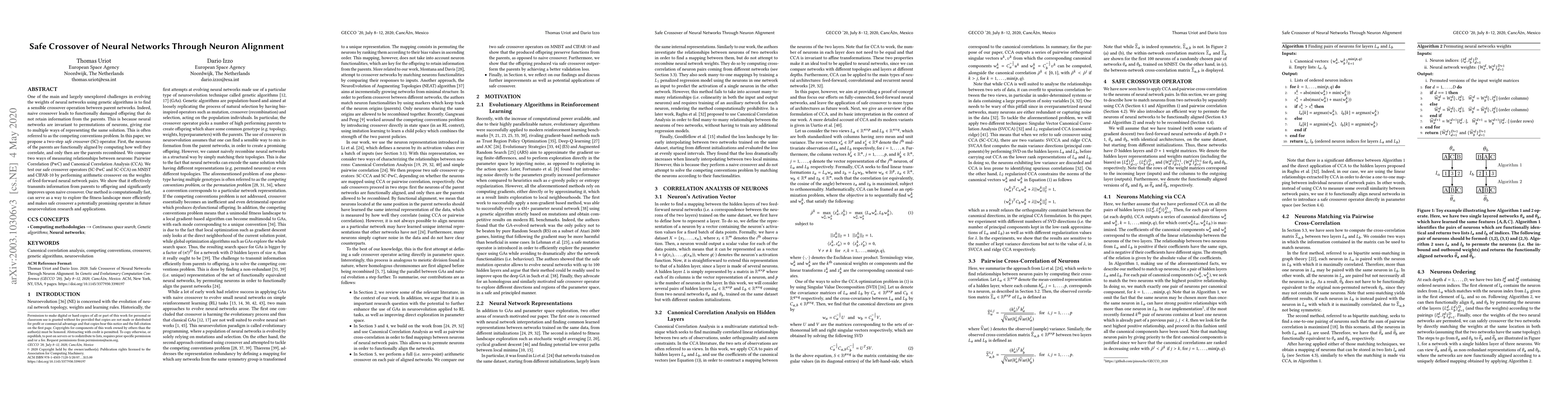 Researchers propose a new method for crossover in neural networks that aligns neurons based on correlation to transmit information from parents to offspring, improving upon traditional naive crossover.