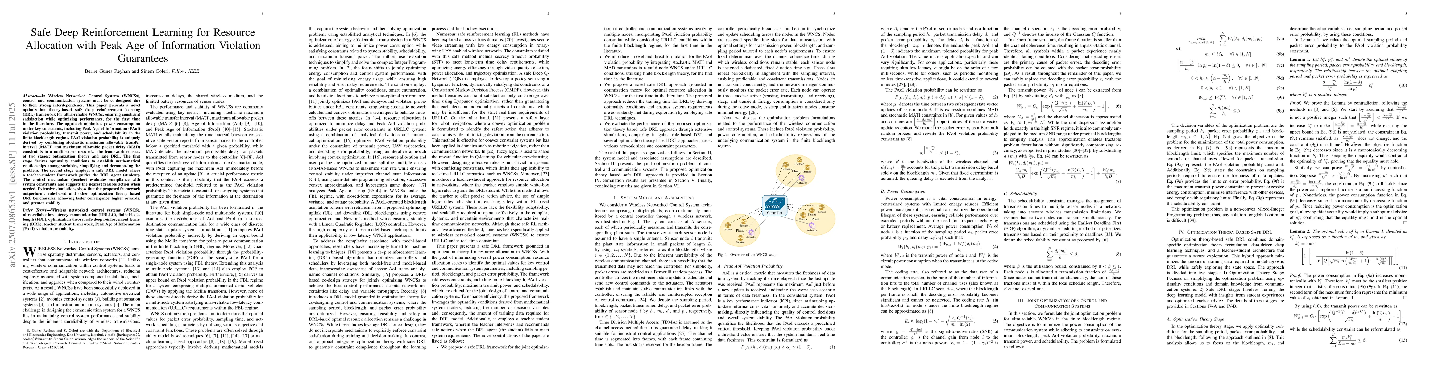 In Wireless Networked Control Systems (WNCSs), control and communication systems must be co-designed due to their strong interdependence. This paper presents a novel optimization theory-based safe deep reinforcement learning (DRL) framework for ultra-reliable WNCSs, ensuring constraint satisfaction while optimizing performance, for the first time in the literature. The approach minimizes power consumption under key constraints, including Peak Age of Information (PAoI) violation probability, transmit power, and schedulability in the finite blocklength regime. PAoI violation probability is uniquely derived by combining stochastic maximum allowable transfer interval (MATI) and maximum allowable packet delay (MAD) constraints in a multi-sensor network. The framework consists of two stages: optimization theory and safe DRL. The first stage derives optimality conditions to establish mathematical relationships among variables, simplifying and decomposing the problem. The second stage employs a safe DRL model where a teacher-student framework guides the DRL agent (student). The control mechanism (teacher) evaluates compliance with system constraints and suggests the nearest feasible action when needed. Extensive simulations show that the proposed framework outperforms rule-based and other optimization theory based DRL benchmarks, achieving faster convergence, higher rewards, and greater stability.