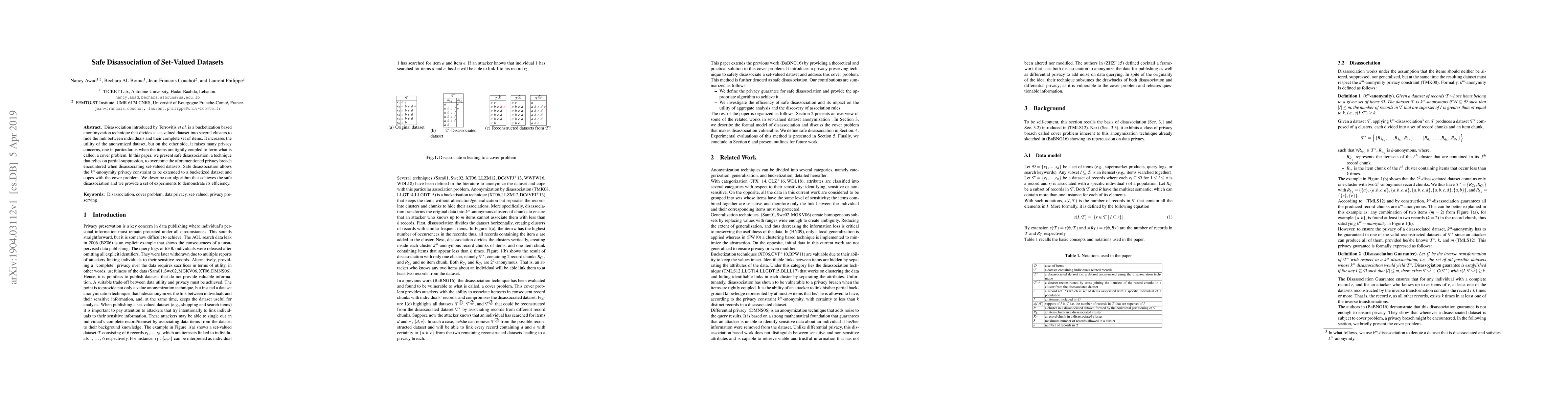 This paper introduces a technique called safe disassociation to anonymize set-valued datasets while addressing privacy concerns such as the cover problem, allowing for $k^m$-anonymity and efficient bucketization.