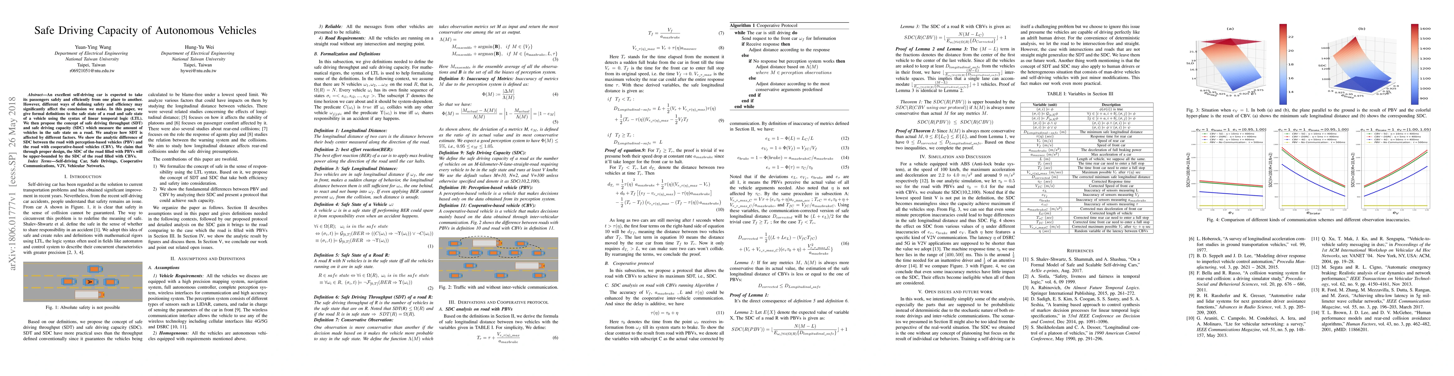 An excellent self-driving car is expected to take its passengers safely and efficiently from one place to another. However, different ways of defining safety and efficiency may significantly affect the conclusion we make. In this paper, we give formal definitions to the safe state of a road and safe state of a vehicle using the syntax of linear temporal logic (LTL). We then propose the concept of safe driving throughput (SDT) and safe driving capacity (SDC) which measure the amount of vehicles in the safe state on a road. We analyze how SDT is affected by different factors. We show the analytic difference of SDC between the road with perception-based vehicles (PBV) and the road with cooperative-based vehicles (CBV). We claim that through proper design, the SDC of the road filled with PBVs will be upper-bounded by the SDC of the road filled with CBVs.