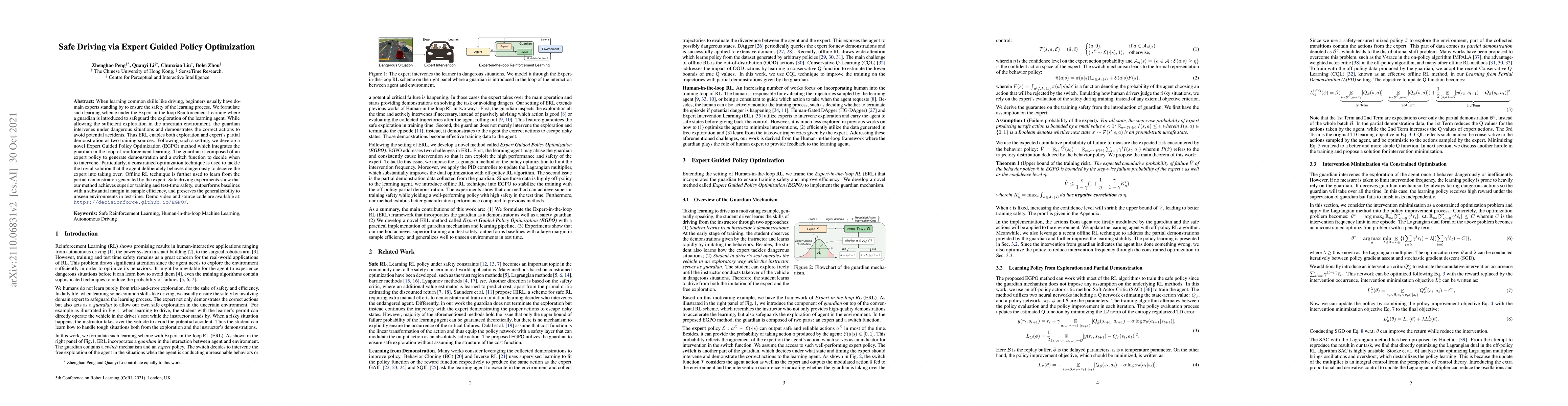 This paper proposes an Expert Guided Policy Optimization (EGPO) method for safe reinforcement learning in driving scenarios, where an expert guardian intervenes to prevent accidents while allowing exploration. The method combines offline reinforcement learning with expert demonstrations and constrained optimization to ensure safety without compromising sample efficiency or generalizability.