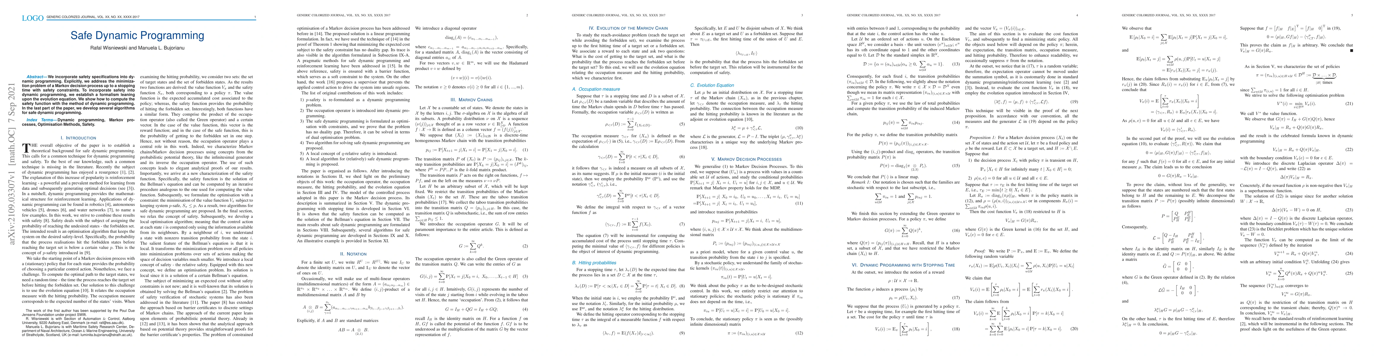 We incorporate safety specifications into dynamic programming. Explicitly, we address the minimization problem of a Markov decision process up to a stopping time with safety constraints. To incorporate safety into dynamic programming, we establish a formalism leaning upon the evolution equation. We show how to compute the safety function with the method of dynamic programming. In the last part of the paper, we develop several algorithms for safe dynamic programming.