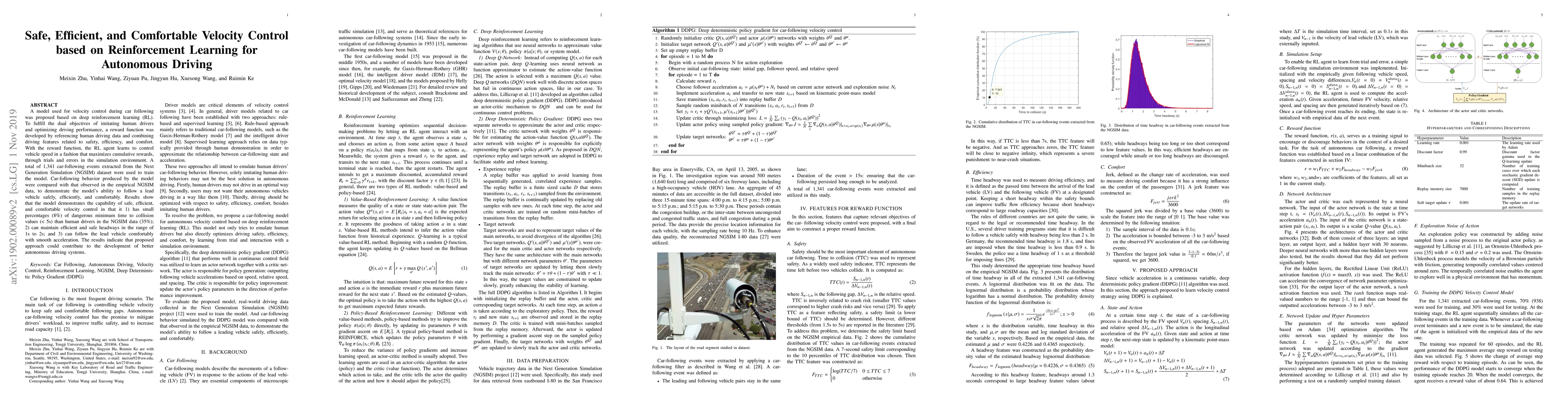This paper proposes a deep reinforcement learning model for velocity control in car following, optimizing for safety, efficiency, and comfort through a constructed reward function. The model demonstrates safe, efficient, and comfortable driving by significantly reducing dangerous collision scenarios and maintaining smooth, human-like acceleration patterns.