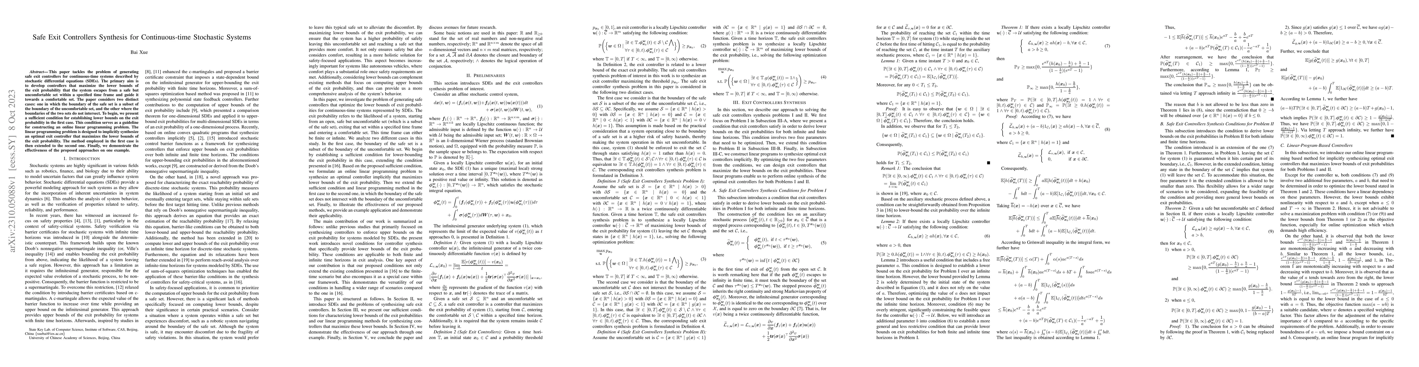 This paper develops safe exit controllers for continuous-time stochastic systems using SDEs, focusing on maximizing the probability of escaping a safe set within a specified time to reach a comfortable set. It presents a sufficient condition and an online linear programming approach for controller synthesis in two distinct boundary scenarios.