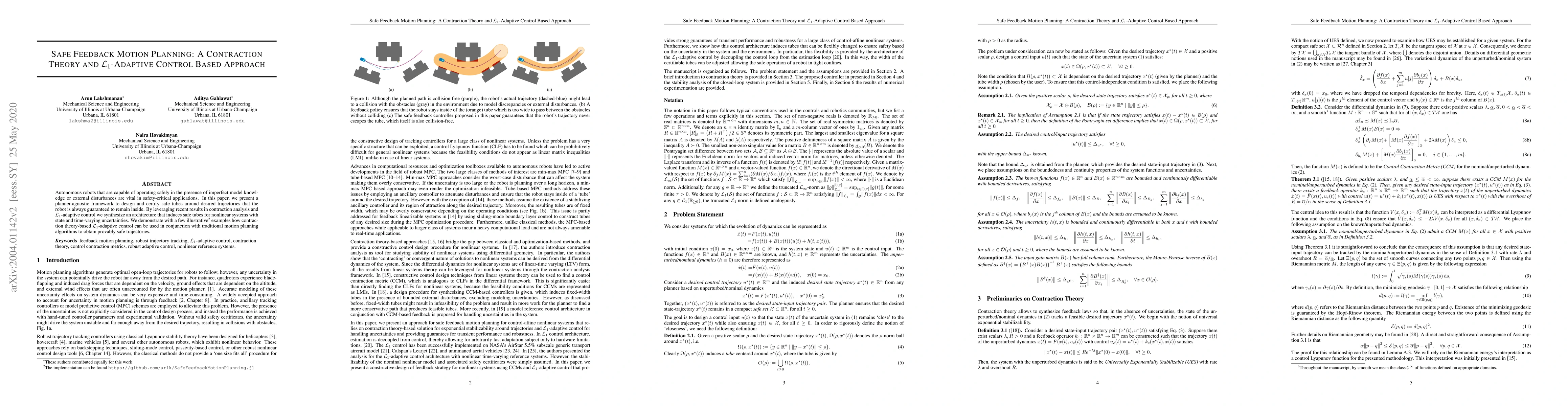 This paper proposes a framework for safe feedback motion planning using contraction theory and $\mathcal{L}_1$-adaptive control. It designs and certifies safe tubes around desired robot trajectories, ensuring safe operation despite model uncertainties and disturbances.