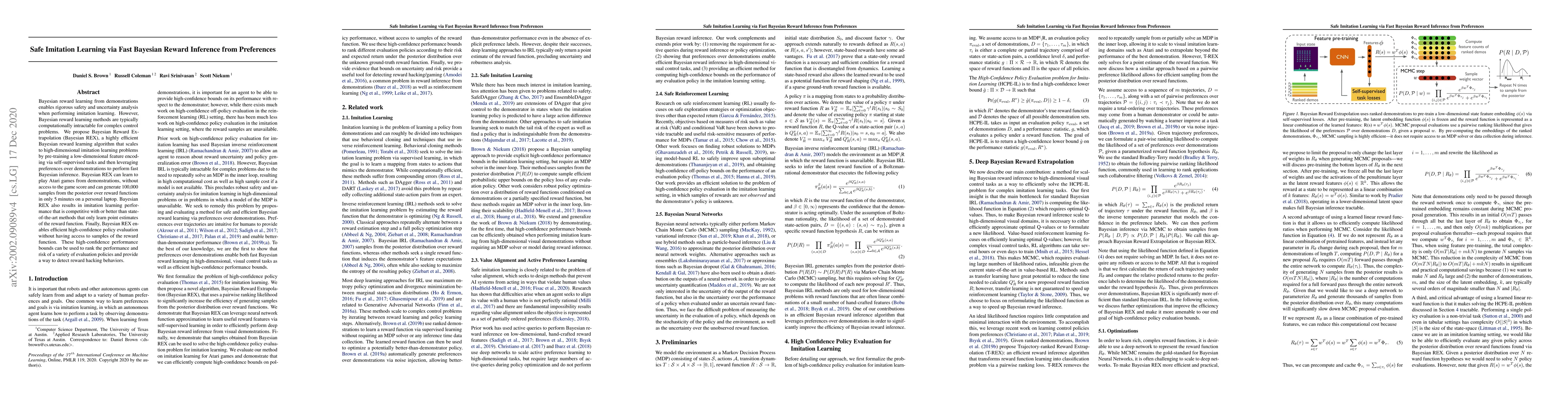 This paper introduces Bayesian Reward Extrapolation (Bayesian REX), an efficient Bayesian reward learning algorithm that scales to high-dimensional imitation learning tasks by using self-supervised pre-training and fast Bayesian inference. It demonstrates superior performance and safety in playing Atari games from demonstrations.