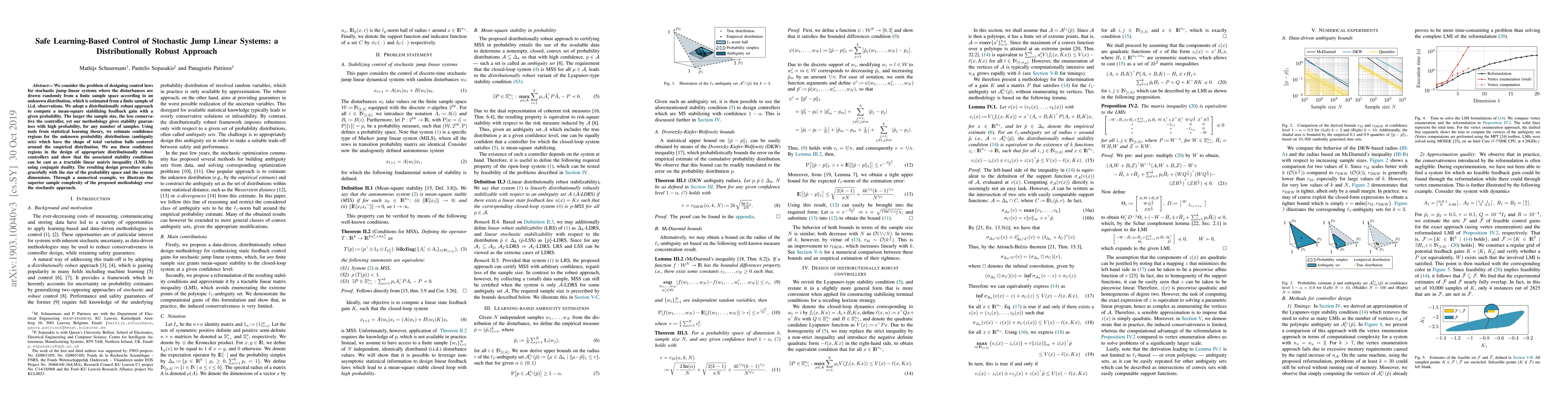 This paper proposes a distributionally robust control method for stochastic jump linear systems with unknown disturbance distributions. It uses statistical learning to estimate confidence regions and designs stabilizing controllers with high probability stability guarantees, expressed as a tractable linear matrix inequality.