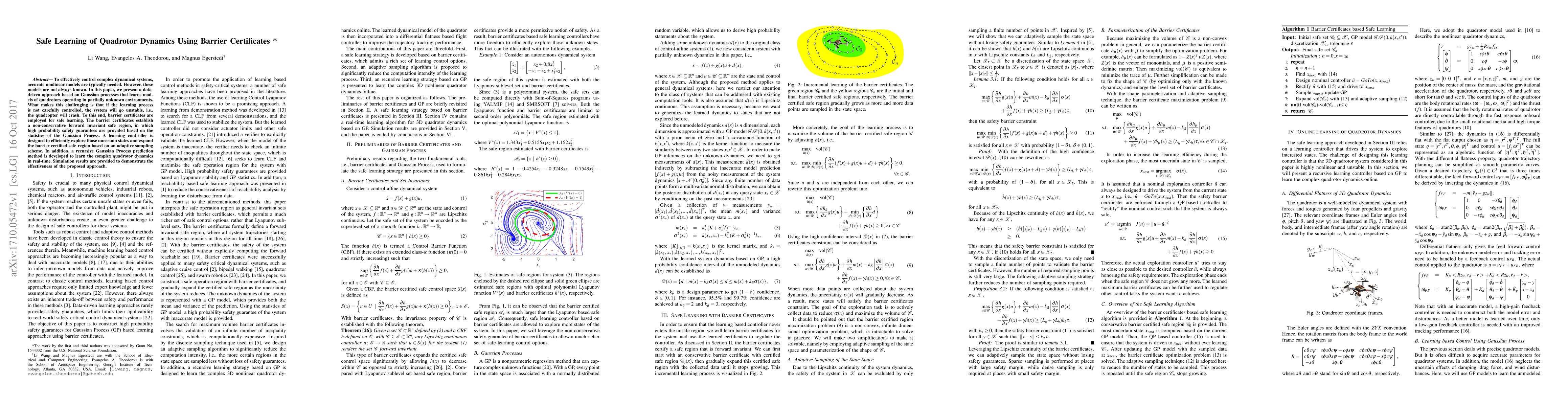 This paper proposes a data-driven method using Gaussian processes to learn quadrotor dynamics in partially unknown environments. It employs barrier certificates to ensure safe learning and stability, providing high probability safety guarantees through adaptive sampling and recursive Gaussian Process prediction.