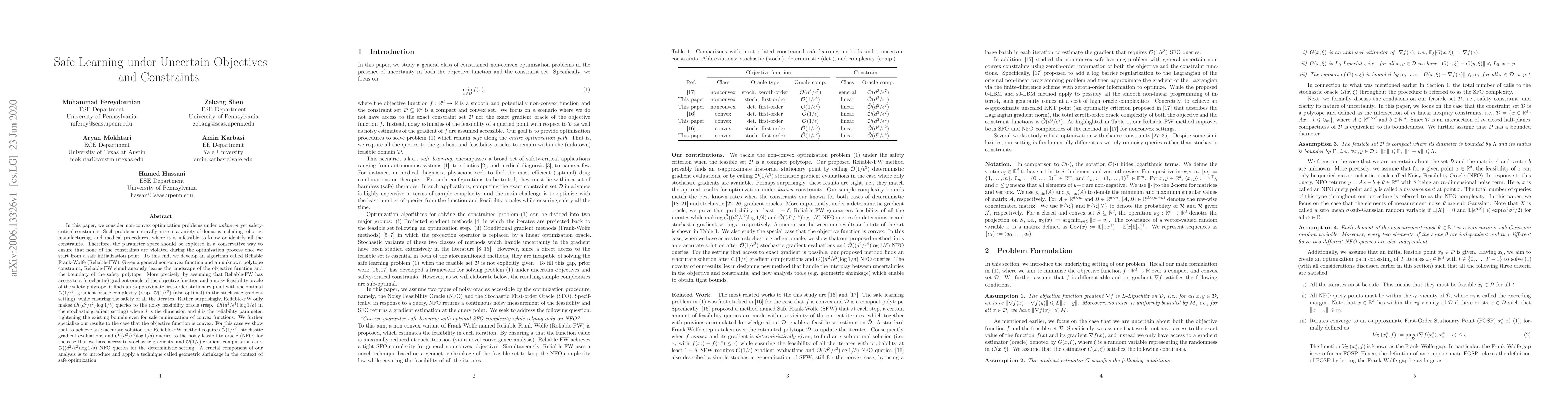 In this paper, we consider non-convex optimization problems under \textit{unknown} yet safety-critical constraints. Such problems naturally arise in a variety of domains including robotics, manufacturing, and medical procedures, where it is infeasible to know or identify all the constraints. Therefore, the parameter space should be explored in a conservative way to ensure that none of the constraints are violated during the optimization process once we start from a safe initialization point. To this end, we develop an algorithm called Reliable Frank-Wolfe (Reliable-FW). Given a general non-convex function and an unknown polytope constraint, Reliable-FW simultaneously learns the landscape of the objective function and the boundary of the safety polytope. More precisely, by assuming that Reliable-FW has access to a (stochastic) gradient oracle of the objective function and a noisy feasibility oracle of the safety polytope, it finds an $\epsilon$-approximate first-order stationary point with the optimal ${\mathcal{O}}({1}/{\epsilon^2})$ gradient oracle complexity (resp. $\tilde{\mathcal{O}}({1}/{\epsilon^3})$ (also optimal) in the stochastic gradient setting), while ensuring the safety of all the iterates. Rather surprisingly, Reliable-FW only makes $\tilde{\mathcal{O}}(({d^2}/{\epsilon^2})\log 1/\delta)$ queries to the noisy feasibility oracle (resp. $\tilde{\mathcal{O}}(({d^2}/{\epsilon^4})\log 1/\delta)$ in the stochastic gradient setting) where $d$ is the dimension and $\delta$ is the reliability parameter, tightening the existing bounds even for safe minimization of convex functions. We further specialize our results to the case that the objective function is convex. A crucial component of our analysis is to introduce and apply a technique called geometric shrinkage in the context of safe optimization.