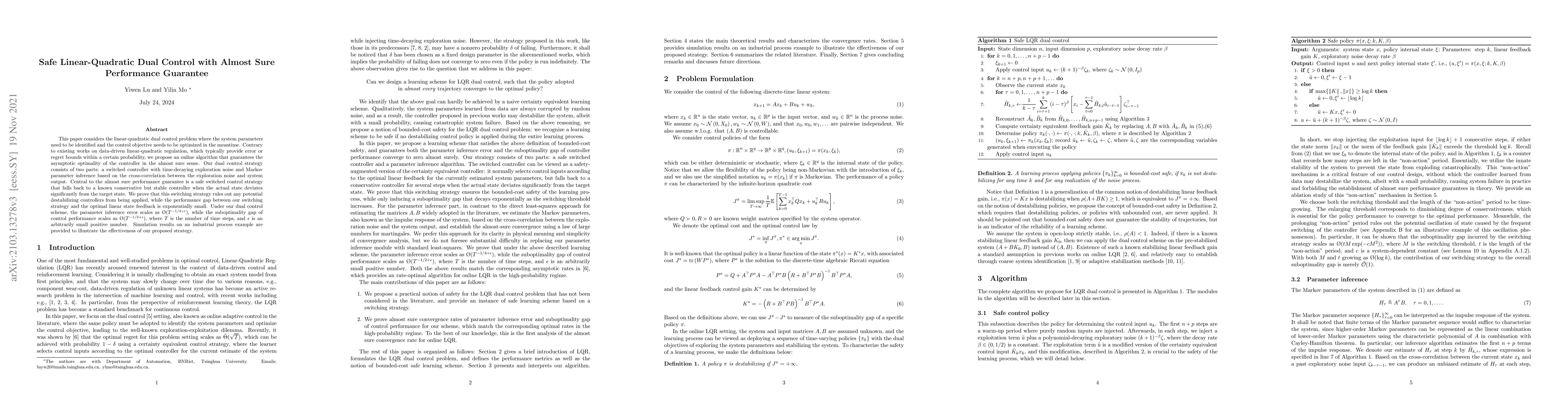 This paper proposes an online algorithm for the linear-quadratic dual control problem that guarantees asymptotic optimality almost surely, featuring a switched controller with adaptive exploration noise and Markov parameter inference. The dual control strategy ensures safe operation by reverting to a conservative controller when significant state deviations occur.