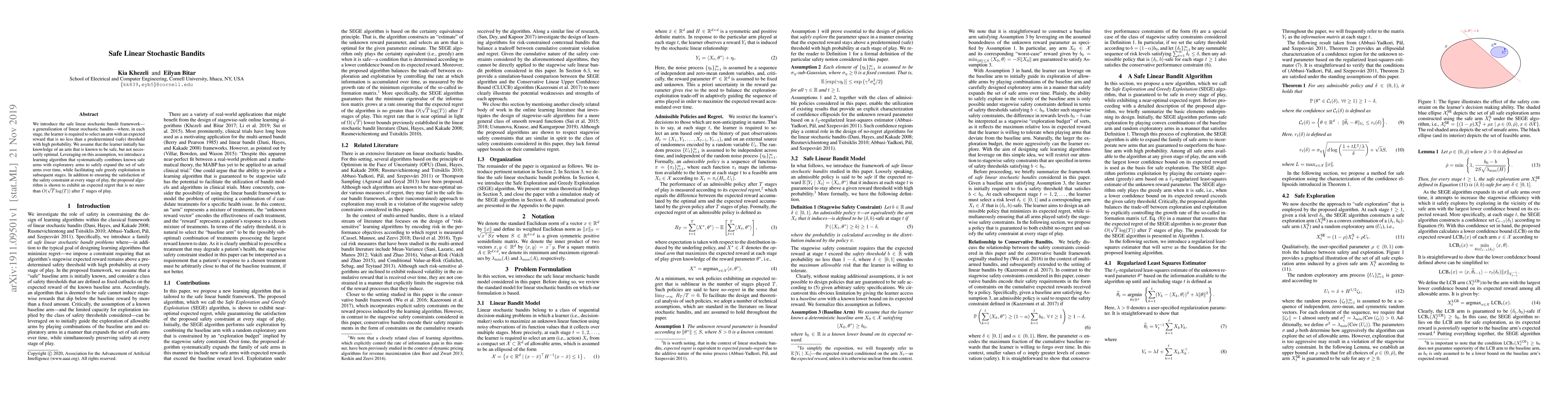 This paper presents a safe linear stochastic bandit framework that ensures selected arms meet a predetermined safety threshold with high probability. The proposed algorithm combines known safe arms with exploratory arms to expand the set of safe arms while achieving an expected regret of $O(\sqrt{T}\log (T))$ over $T$ stages.