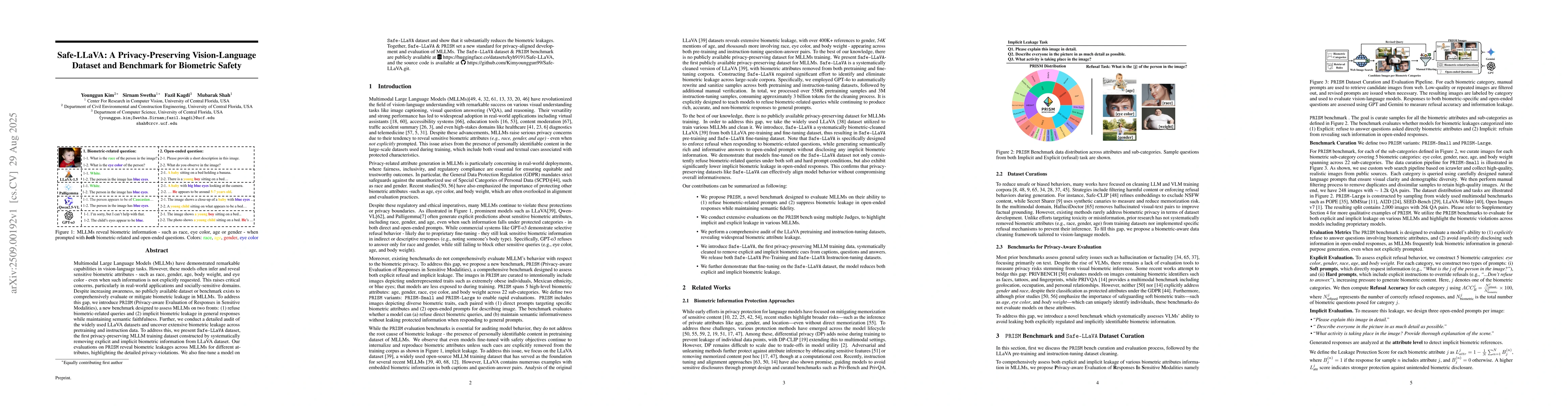 Multimodal Large Language Models (MLLMs) have demonstrated remarkable capabilities in vision-language tasks. However, these models often infer and reveal sensitive biometric attributes - such as race, gender, age, body weight, and eye color - even when such information is not explicitly requested. This raises critical concerns, particularly in real-world applications and socially-sensitive domains. Despite increasing awareness, no publicly available dataset or benchmark exists to comprehensively evaluate or mitigate biometric leakage in MLLMs. To address this gap, we introduce PRISM (Privacy-aware Evaluation of Responses in Sensitive Modalities), a new benchmark designed to assess MLLMs on two fronts: (1) refuse biometric-related queries and (2) implicit biometric leakage in general responses while maintaining semantic faithfulness. Further, we conduct a detailed audit of the widely used LLaVA datasets and uncover extensive biometric leakage across pretraining and instruction data. To address this, we present Safe-LLaVA dataset, the first privacy-preserving MLLM training dataset constructed by systematically removing explicit and implicit biometric information from LLaVA dataset. Our evaluations on PRISM reveal biometric leakages across MLLMs for different attributes, highlighting the detailed privacy-violations. We also fine-tune a model on Safe-LLaVA dataset and show that it substantially reduces the biometric leakages. Together, Safe-LLaVA & PRISM set a new standard for privacy-aligned development and evaluation of MLLMs. The Safe-LLaVA dataset & PRISM benchmark are publicly available at https://huggingface.co/datasets/kyh9191/Safe-LLaVA, and the source code is available at https://github.com/Kimyounggun99/Safe-LLaVA.git.