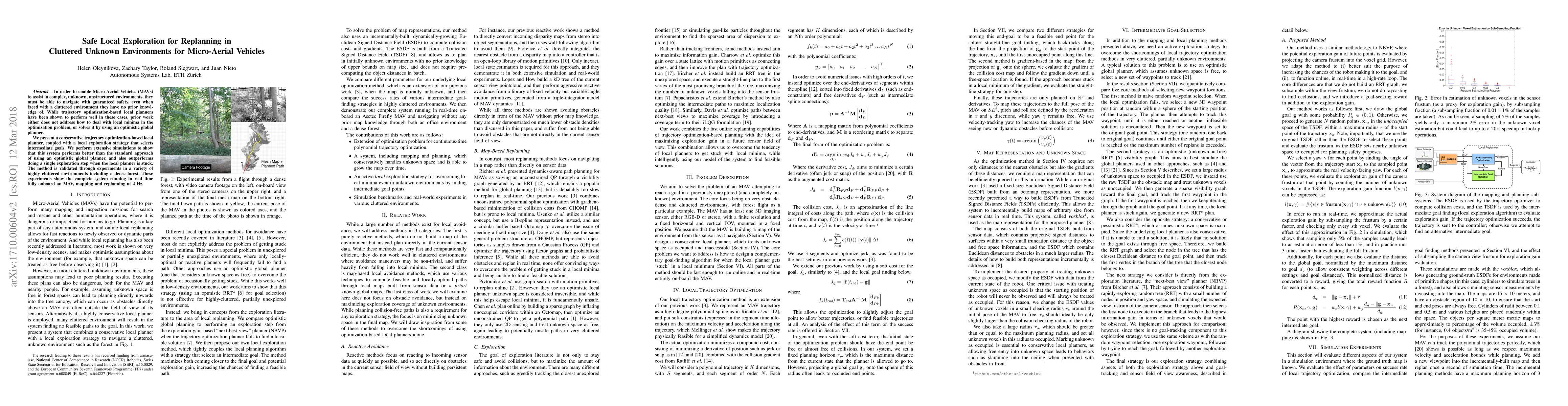In order to enable Micro-Aerial Vehicles (MAVs) to assist in complex, unknown, unstructured environments, they must be able to navigate with guaranteed safety, even when faced with a cluttered environment they have no prior knowledge of. While trajectory optimization-based local planners have been shown to perform well in these cases, prior work either does not address how to deal with local minima in the optimization problem, or solves it by using an optimistic global planner. We present a conservative trajectory optimization-based local planner, coupled with a local exploration strategy that selects intermediate goals. We perform extensive simulations to show that this system performs better than the standard approach of using an optimistic global planner, and also outperforms doing a single exploration step when the local planner is stuck. The method is validated through experiments in a variety of highly cluttered environments including a dense forest. These experiments show the complete system running in real time fully onboard an MAV, mapping and replanning at 4 Hz.