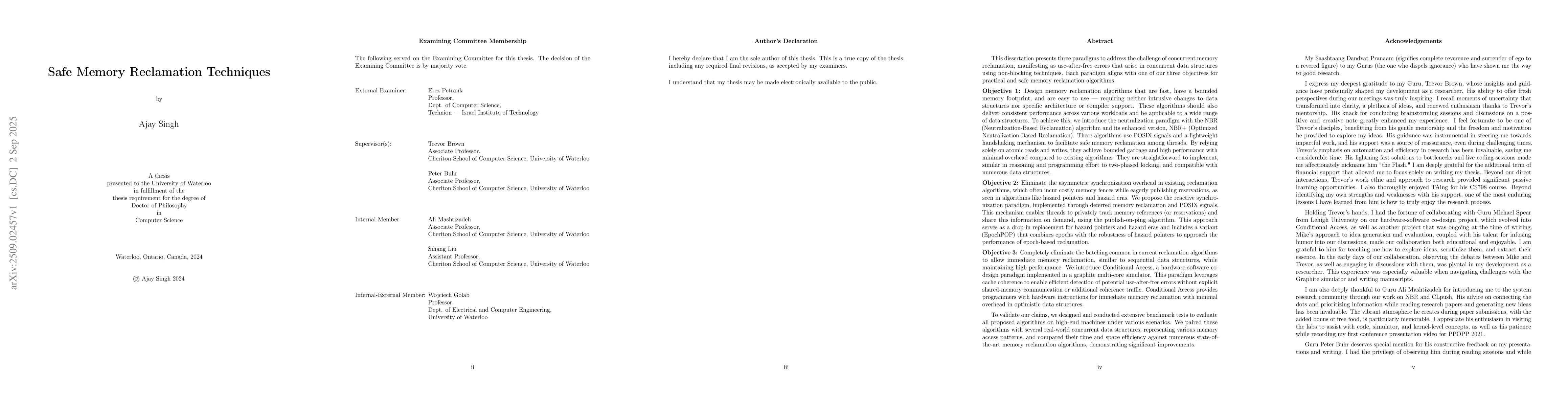 Safe memory reclamation is crucial to memory safety for optimistic and lock-free concurrent data structures in non garbage collected programming languages. However, several challenges arise in designing an ideal safe memory reclamation algorithm, including achieving high speed and scalability, easy of use for programmers, applicability to wide class of data structures, managing the large memory footprint caused by delayed freeing of memory for safety and performance, and avoiding asymmetric overhead on data structure operations. Several approaches to designing safe memory reclamation algorithms are studied by blending ideas and tools from across the hardware-software stack. These solutions cross traditional boundaries and exploit features exposed at different layers.