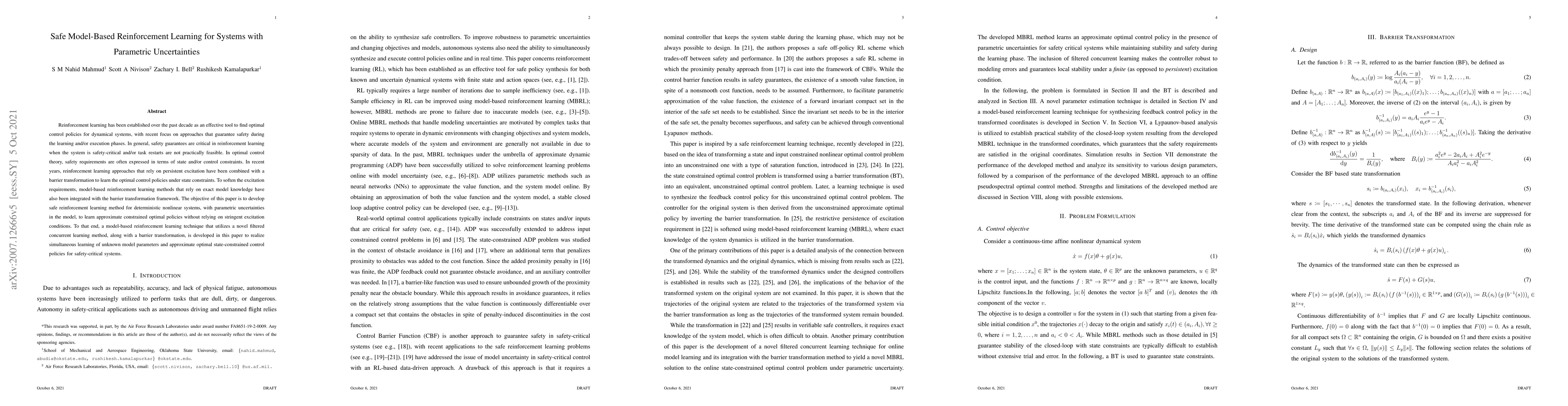 This paper proposes a safe model-based reinforcement learning method for deterministic nonlinear systems with parametric uncertainties, using a novel filtered concurrent learning technique combined with a barrier transformation to learn approximate constrained optimal control policies without stringent excitation conditions. The approach ensures safety during learning and execution phases for safety-critical systems.