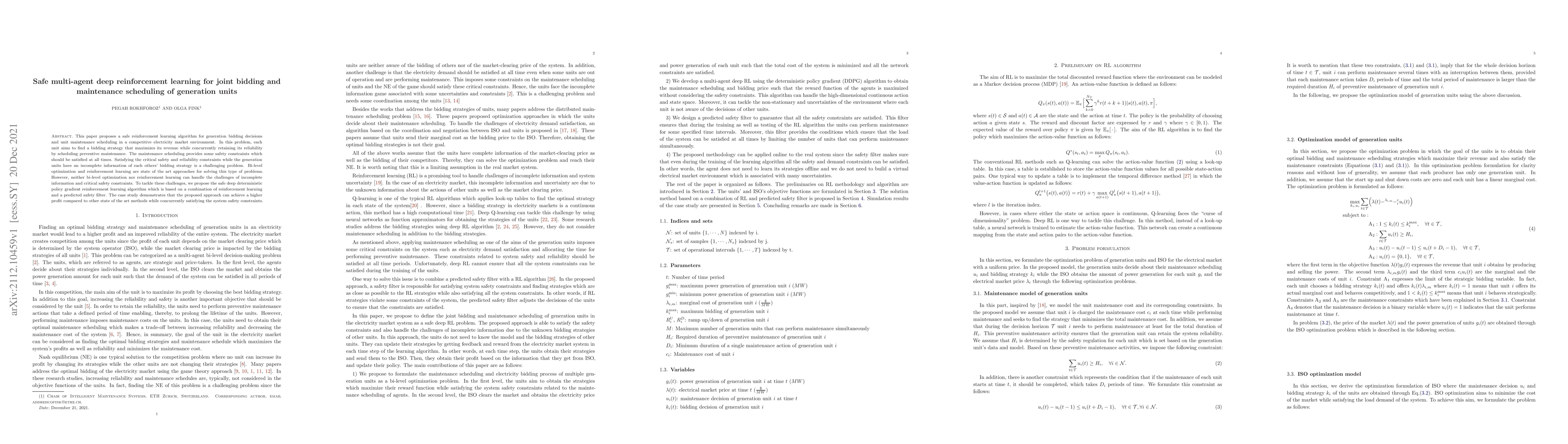 This paper proposes a safe reinforcement learning algorithm for generation bidding decisions and unit maintenance scheduling in a competitive electricity market environment. In this problem, each unit aims to find a bidding strategy that maximizes its revenue while concurrently retaining its reliability by scheduling preventive maintenance. The maintenance scheduling provides some safety constraints which should be satisfied at all times. Satisfying the critical safety and reliability constraints while the generation units have an incomplete information of each others' bidding strategy is a challenging problem. Bi-level optimization and reinforcement learning are state of the art approaches for solving this type of problems. However, neither bi-level optimization nor reinforcement learning can handle the challenges of incomplete information and critical safety constraints. To tackle these challenges, we propose the safe deep deterministic policy gradient reinforcement learning algorithm which is based on a combination of reinforcement learning and a predicted safety filter. The case study demonstrates that the proposed approach can achieve a higher profit compared to other state of the art methods while concurrently satisfying the system safety constraints.